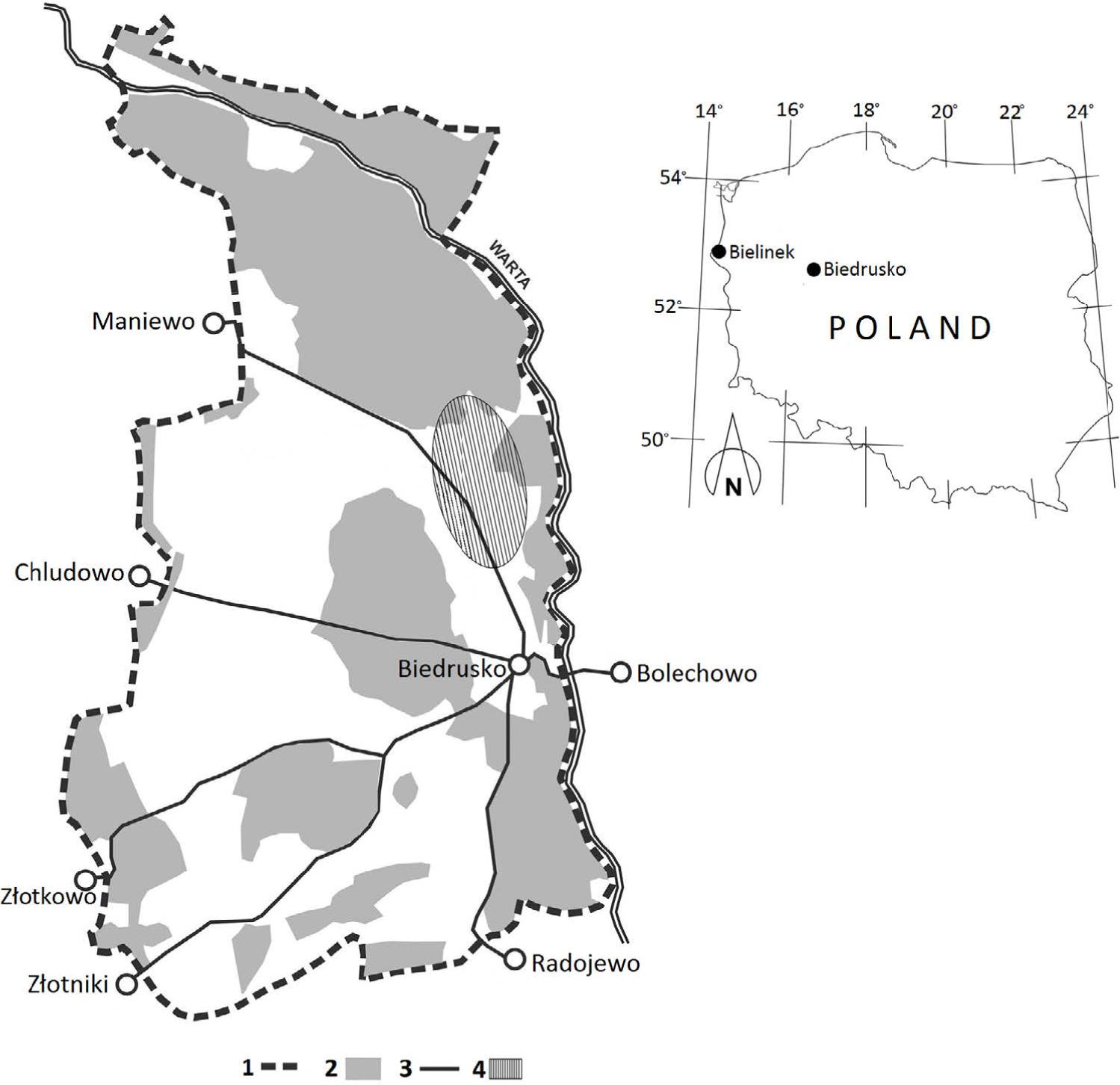 The military area covers over 7000 hectares and is bordered by the river Warta in the north and east; in the south its limits are near the villages of Radojewo and Złotniki, while in the east, near the villages of Złotkowo, Chludowo, Maniewo, Gołębowo and Gołaszyn. The headquarters are in Biedrusko (52°32′34,78″N 16°56′49,34″E) (Fig. 1).