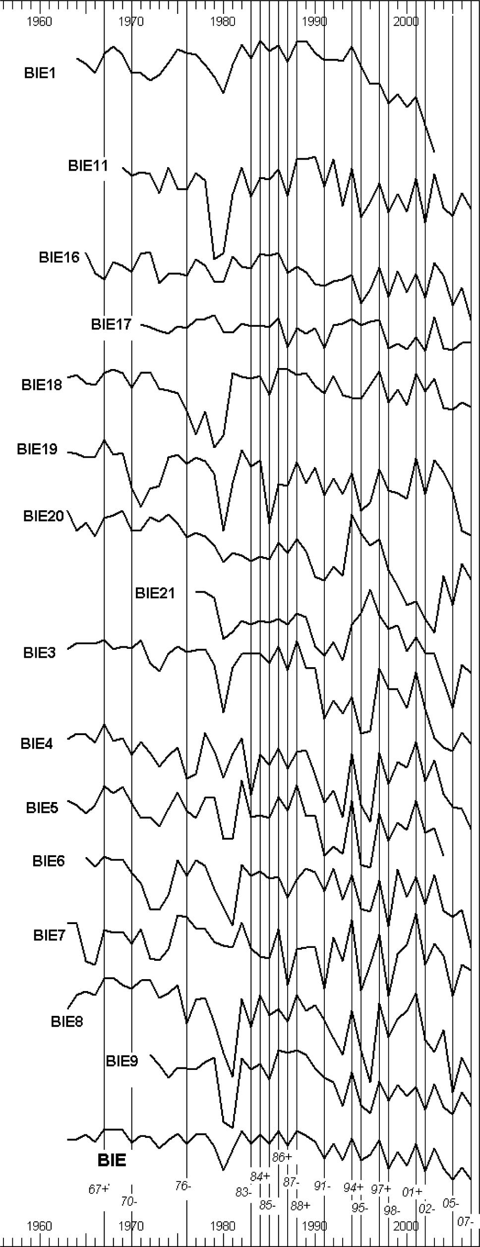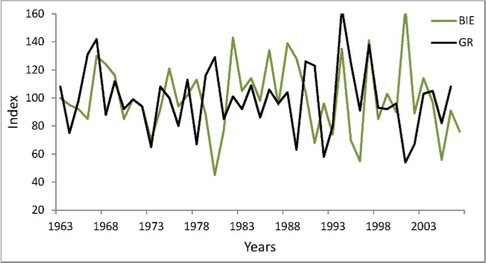 Comparison of the wild pear indexes chronologies (BIE and GR) in time span 1963–2007.