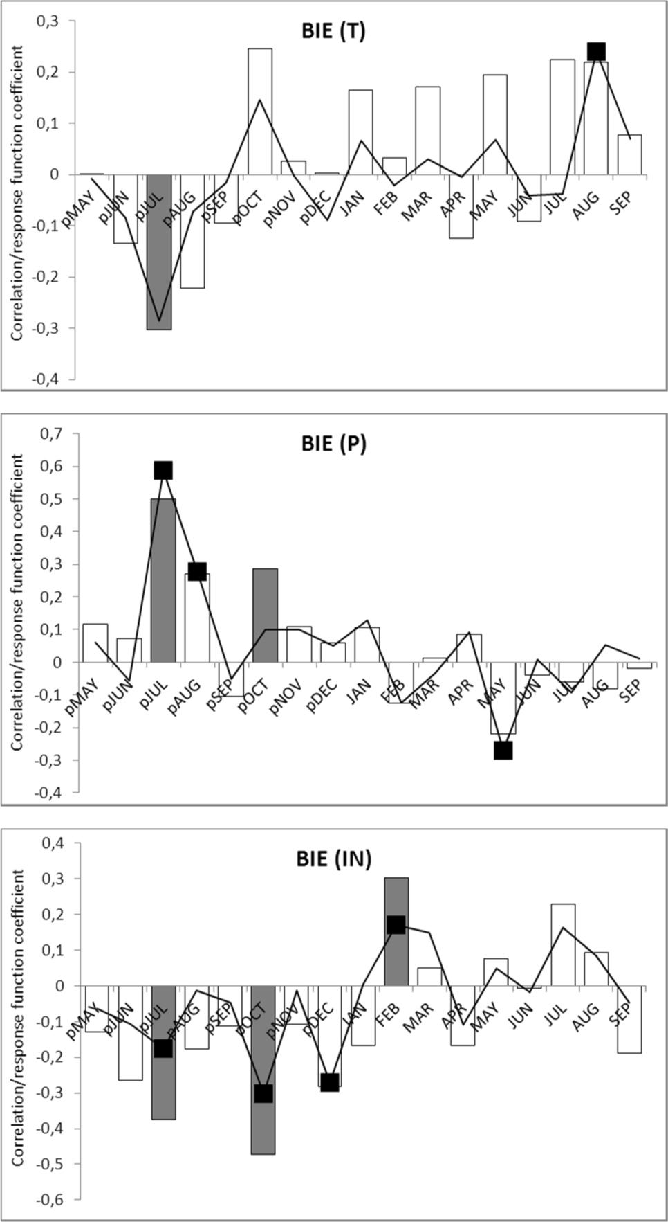 Results of correlation and response function analyses for wild pear chronology (BIE) and air temperature (T), precipitation (P) and insolation (IN); bars denote correlation coefficients; line represents the response function; significant values (α = 0.05) are marked as black squares and grey bars; “p” before month denotes previous year.