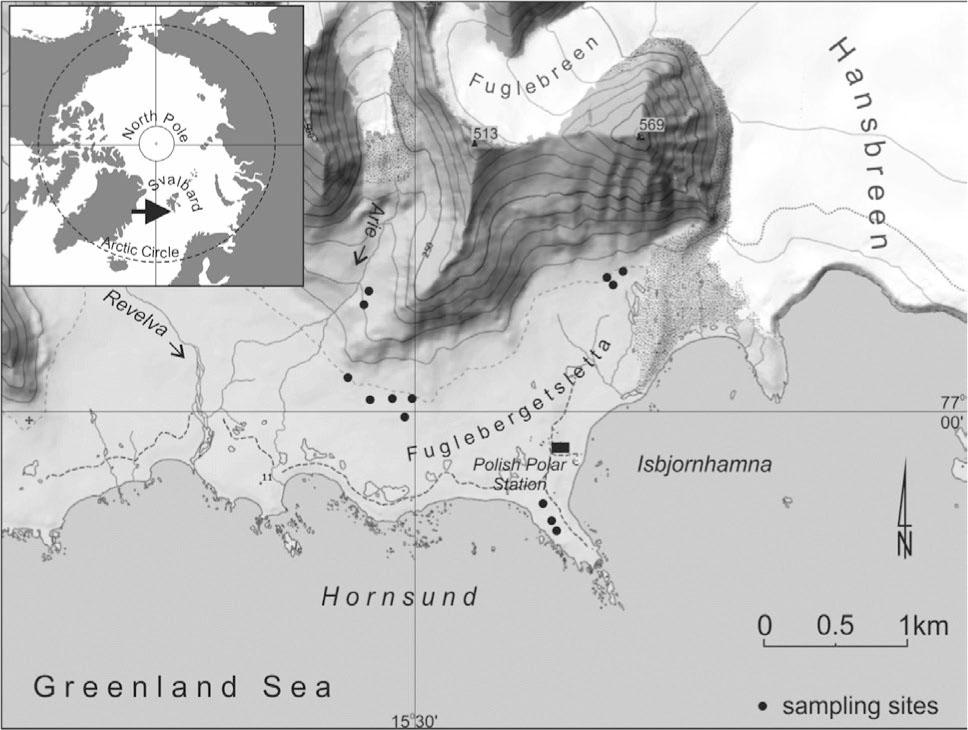 Location map showing the sampling sites in the southwestern Spitsbergen in the vicinity of the Polish Polar Station in Hornsund.