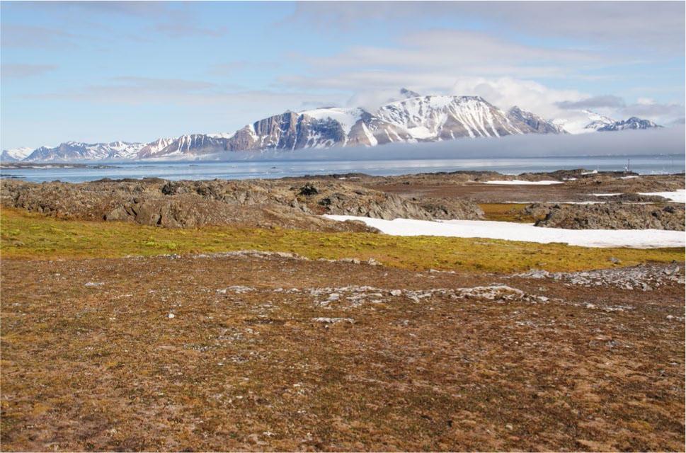 General view on the typical sampling area in northwestern shore ofHornsund fjord; flat raised marine terraces with tundra vegetation are visible in the foreground.