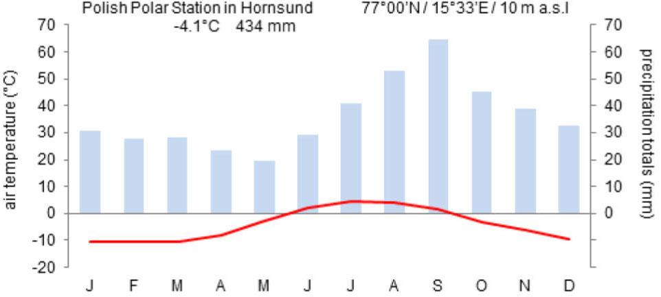 Spitsbergen has a periglacial climate often referred to as the "High Arctic climate" (Przybylak, 2016). Over the last 30 years, mean annual air temperature in the Hornsund area has varied from –7.4°C (1988) to –1.5°C (2006) with an average of–4.2°C (Marsz and Styszyńska, 2013; Hornsund GLACIO-TOPOCLIM Database, 2014). Inter-annual fluctuations of temperature are typical of this area but a distinct warming trend is evident. Nordli (2010) has calculated air temperature trends for about the last 100 years in Svalbard, which is +0.24°C per decade, but during the last 30 years the growth has been faster (+1.1°C per decade) (Marsz and Styszyńska, 2013) (Fig. 3). The annual total precipitation in this area is 434 mm/year (1979–2012). The extreme daily totals are observed in August and September (43–58 mm) (Hornsund GLACIO-TOPOCLIM Database, 2014). The growing season in this part of Spitsbergen is restricted to three months and usually begins in the first half of June when the ground temperature first exceeds 0°C (Fig. 4).