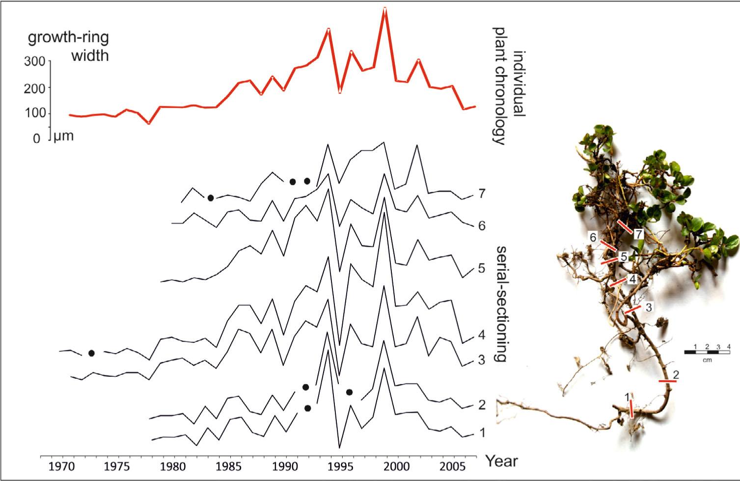 The Salix polaris measurements followed the standard dendrochronological procedures (Cook and Kairiukstis, 1990 and Speer, 2010). The ring widths were measured along two or three radii using the OSM 3.65 and PAST4 software (VIAS, 2005). The TSAP software was used for visual cross-dating of growth width series, and the COFECHA software for the statistical quality control of cross-dating (Holmes, 1983). Locally absent or wedging rings were examined by applying serial sectioning for each individual (Fig. 6) (Kolishchuk, 1990).