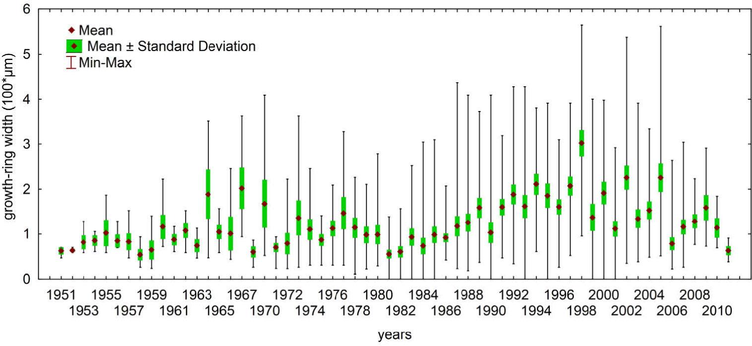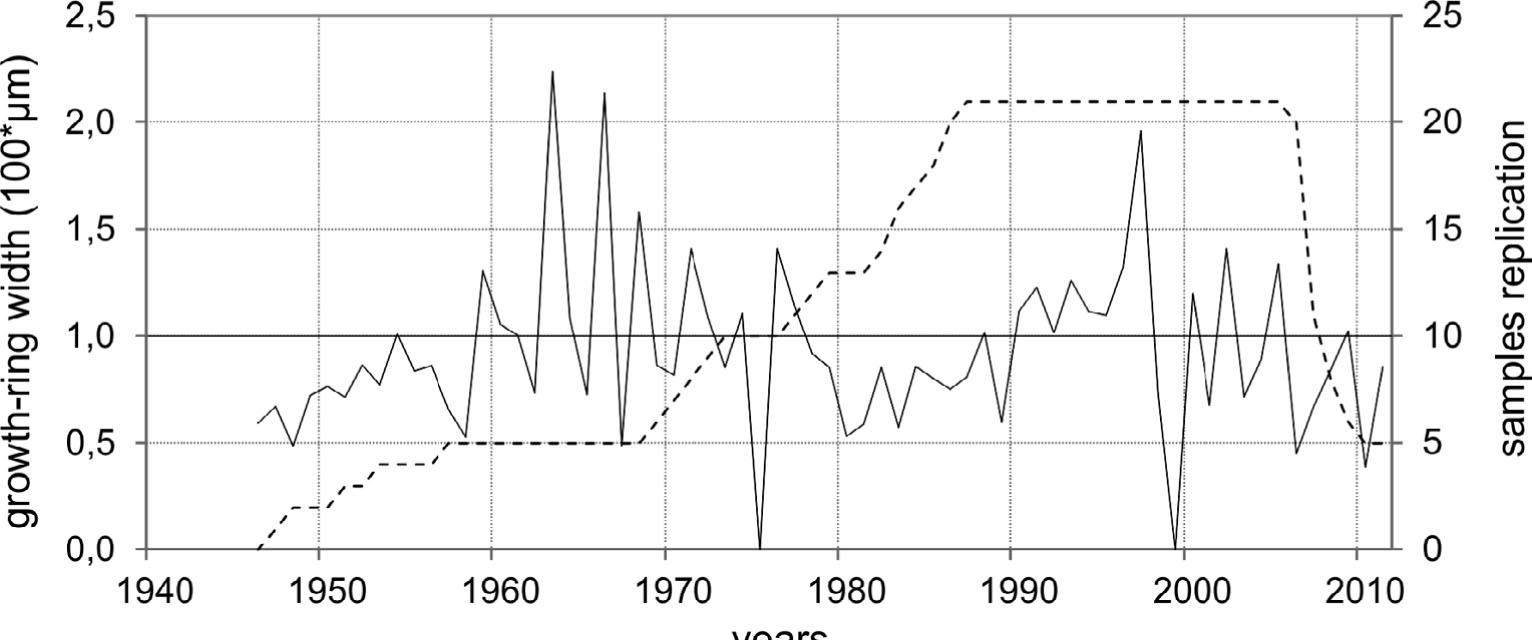 The developed chronology shows very high inter-annual variations expressed by quite a high value of the mean sensitivity (0.56) (Table 1). The Expressed Population Signal values were slightly below the 0.85 threshold (Wigley et al., 1984), and their mean value for the whole chronology was 0.82 (this value decreased in the oldest part of the chronology). This means that in order to reduce the reconstruction uncertainty in the future it will be necessary to increase the sample size (number of plants), especially of the oldest individuals.