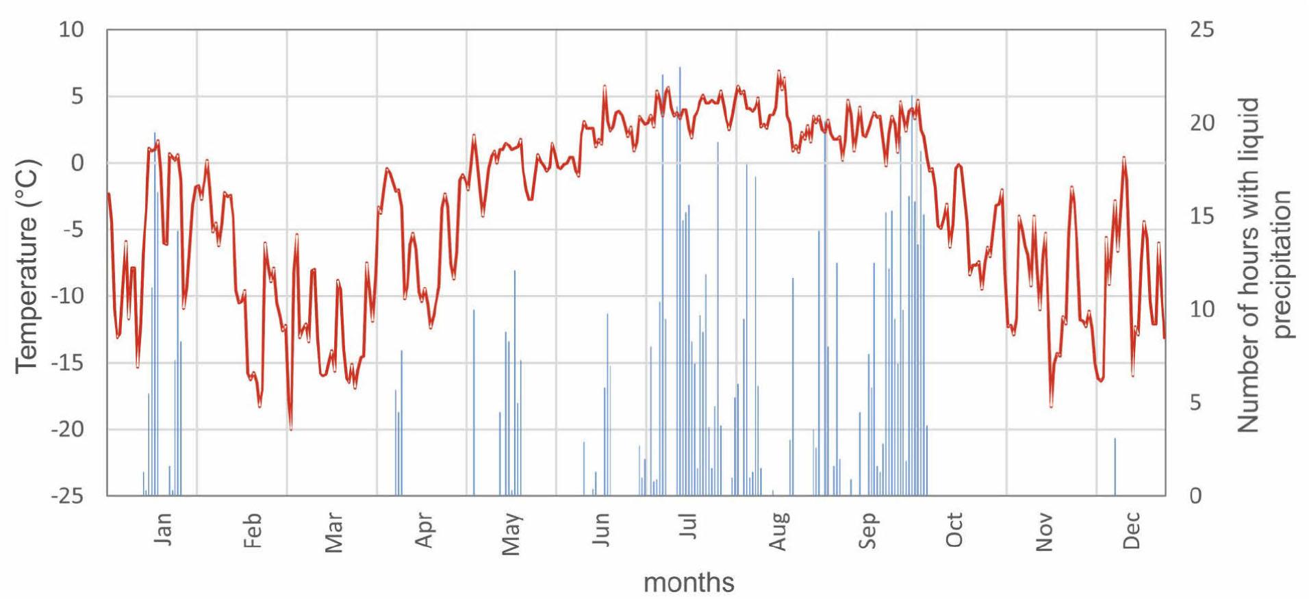 Annual course of daily mean air temperature and number of hours with liquid precipitation in 2010 in the Polish Polar Station, Hornsund (GLACIO-TOPOCLIM Database, 2014).