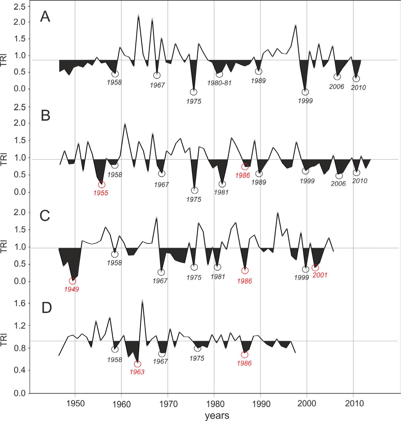 Tree-ring chronologies for different location of North Atlantic sector, including southwestern Spitsbergen and north coast of Eurasia: A — Salix polaris from Svalbard (this study), B — Betula pubescens from Troms Region, northern Norway (Opala et al. 2014), C — Salix lanata from Nenets Autonomous Okrug, northwest Russia (ITRDB, 2015a and Forbes et al., 2010), D — Pinus sylvestris from Kola Peninsula, northwest Russia (ITRDB, 2015b and Gervais and MacDonald, 2000). Black circles indicate negative pointer years common within all chronologies. Red circles indicate negative pointer years present only in single locations (not observed in Hornsund site).