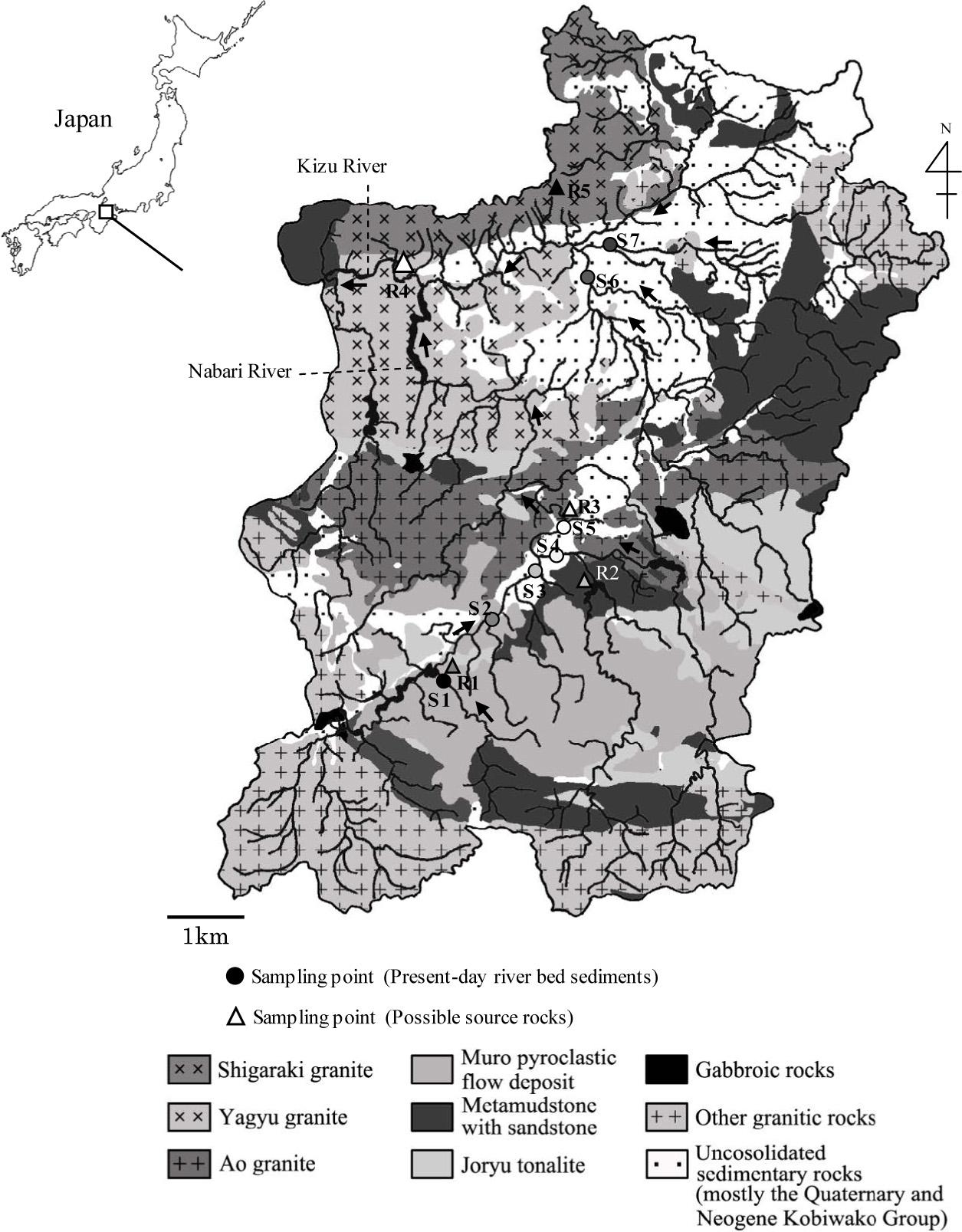 Bedrock is broken down by weathering into unconsolidated materials, which are then carried downstream by rivers. In this study, modern river bed sediments and bedrock samples were collected at sites S1–S7and R1– R5, respectively, from the Kizu River basin, western Japan (Fig. 1). The total length of the Kizu River is 89 km, and the basin covers an area of 1663 km2.