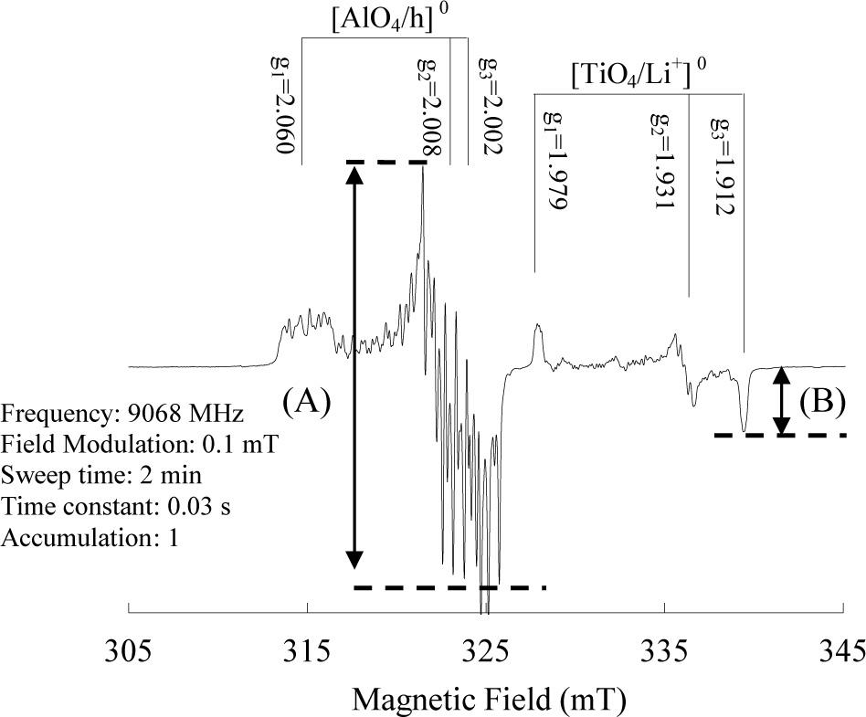 Al and Ti–Li center signals observed at 77 K for quartz in the Muro pyroclastic flow deposits. (A) Al center signal intensity. (B) Ti–Li center signal intensity.