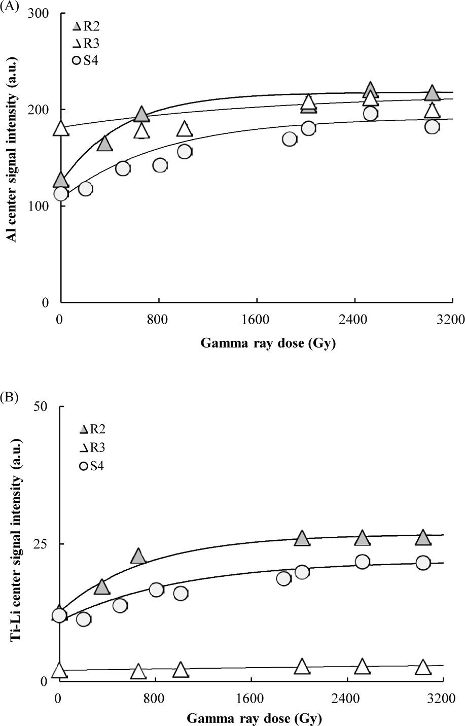 Comparison of additive dose curves of Al and Ti–Li centers. (A) Al center signal intensity. (B) Ti–Li center signal intensity.