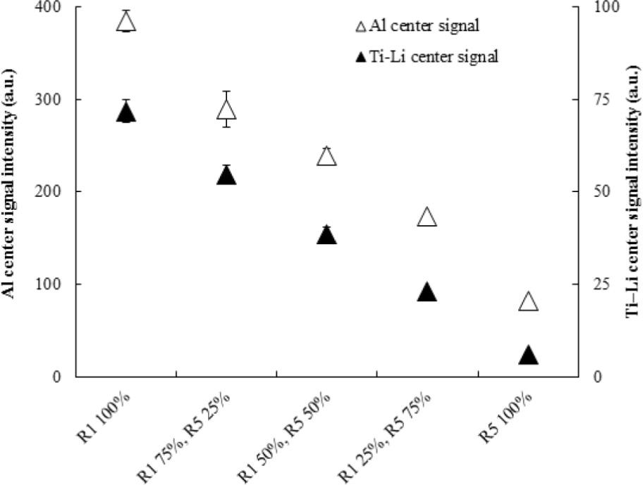| R1 mixting ratio (%) | R5 mixting ratio (%) | Al center signal intensity (a.u.) | Ti–Li center signal intensity (a.u.) | |