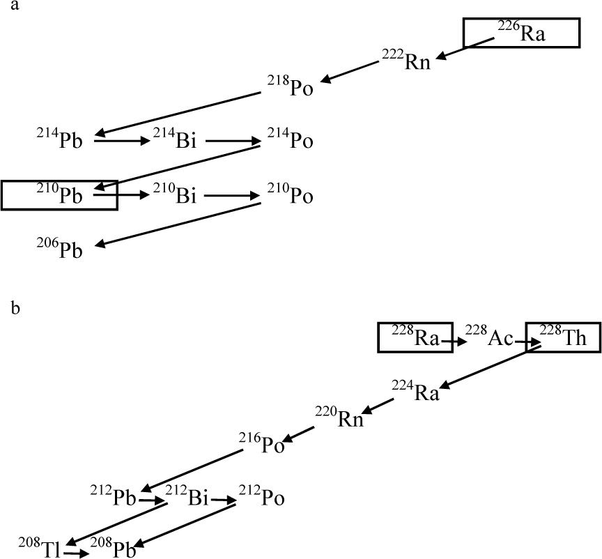 It should be noted that 210Pb has the longest half-life of 22.3 y in the decay series after 226Ra with a half-life of 1600 y (Fig. 1a), and that 228Th has the longest half-life of 1.91 y in the decay series after 228Ra with a half-life of 5.75 y (Fig. 1b), therefore, other radioactive disequilibrium can be neglected.