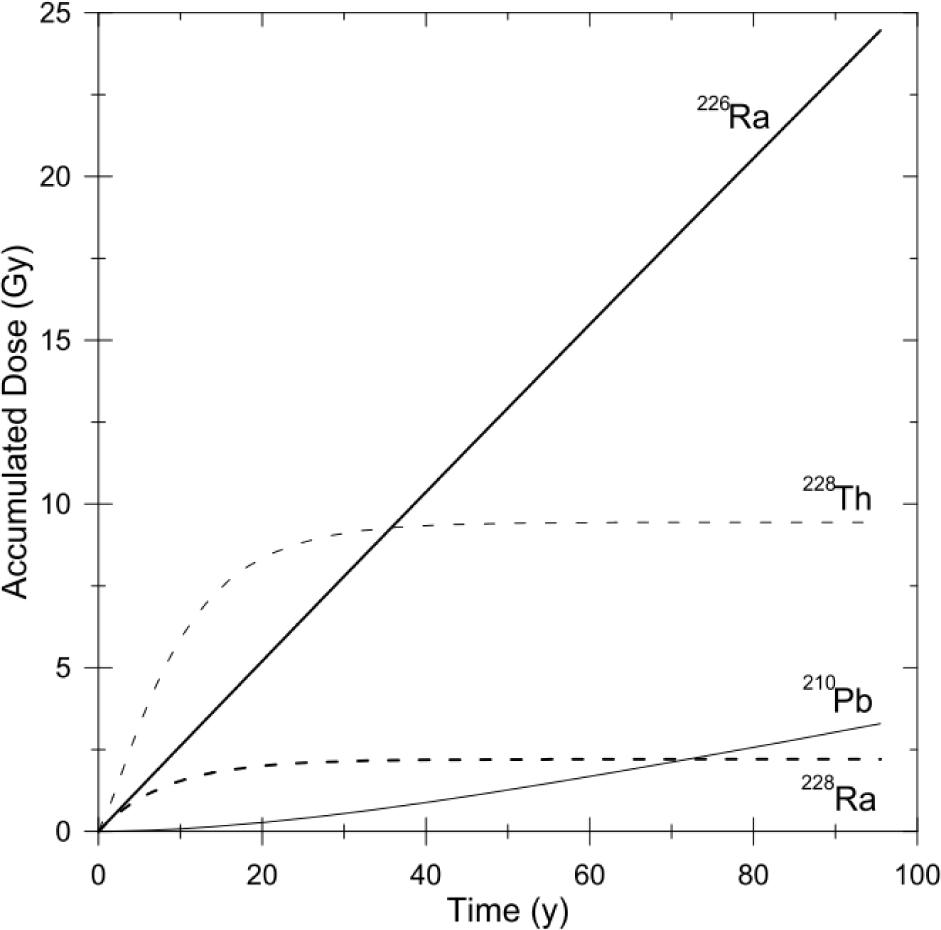 The contribution of the radiation doses from 228Ra and its daughter nuclei to the accumulated dose to barite in this test sample, HPD1621R03, is simulated as a function of time as in the following. Based on the ESR age obtained as above, the initial (when the age of the sample is zero) bulk concentrations of 226Ra and 228Ra are calculated to be 17.0 Bq/g and 59.4 Bq/g, respectively.