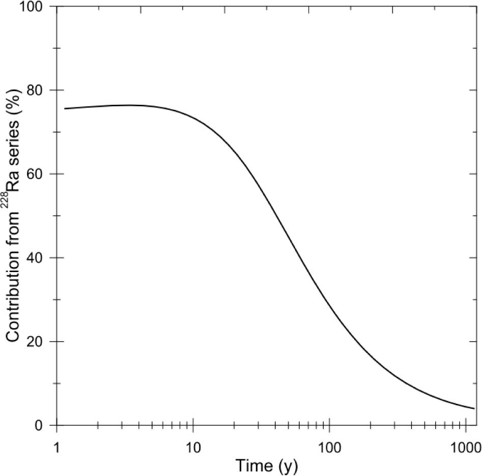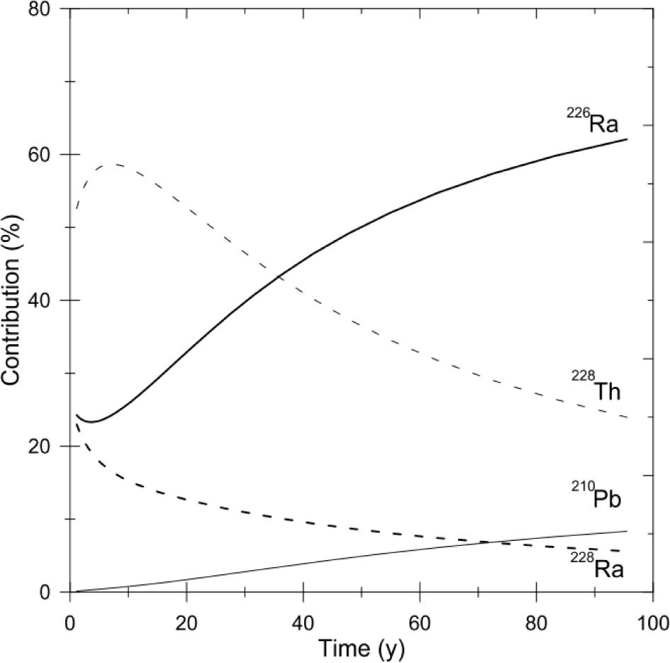 From the values shown in (Fig. 2), the contributions of the accumulated doses are calculated as a function of time and shown in % (Fig. 3) from 226Ra to 214Po, 210Pb to 206Pb, 228Ra and 228Ac, and 228Th to 208Pb, indicated by 26Ra, 210Pb, 228Ra, and 228Th, respectively. The contribution from 228Th to 208Pb reaches 60% at its maximum and remains still 30% at 100 years when the nuclei have already decayed out.