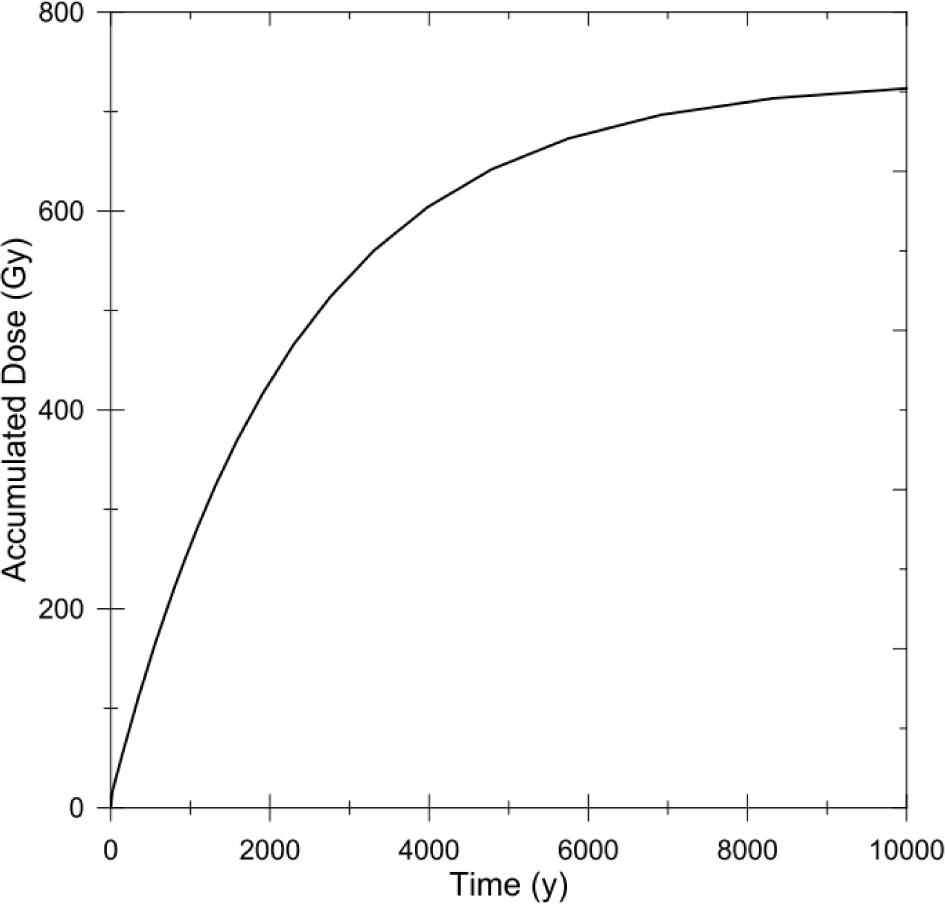The total of the accumulated dose as a function of time up to 10 ka. The accumulated dose saturates due to decay of 226Ra.