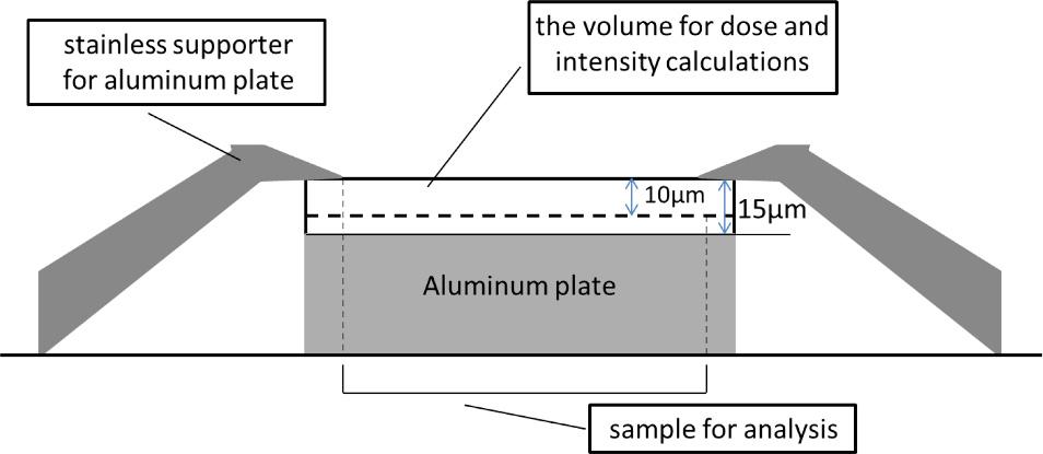 A Tandem accelerator at Takasaki Ion Accelerators for Advanced Radiation Application (TIARA) of Japan Atomic Energy Agency (JAEA) was used to implant the He+ ions into the deposited samples where the aluminum plates were attached on a copper plate. The He+ ions with an energy of 4 MeV was implanted with a current of about 200 nA in duration of 2 to 80 seconds to an area of about 2 cm2. The number of implanted He+ ions were monitored by integrating the current during the implantation where the total number ranged 1.2× 1012 to 5.0×1013 ions/cm2. The samples were peeled from an aluminum plate for ESR measurements. The doses given to the samples were calculated by dividing the total energy of He+ ions, that have passed the surface of the barite samples deposited on an aluminum plates, by the mass of barite sample on the aluminum plate, the surface of which the He+ ions passed, and in the volume of which He+ ions reached (10 μm from the surface, see Fig. 1).