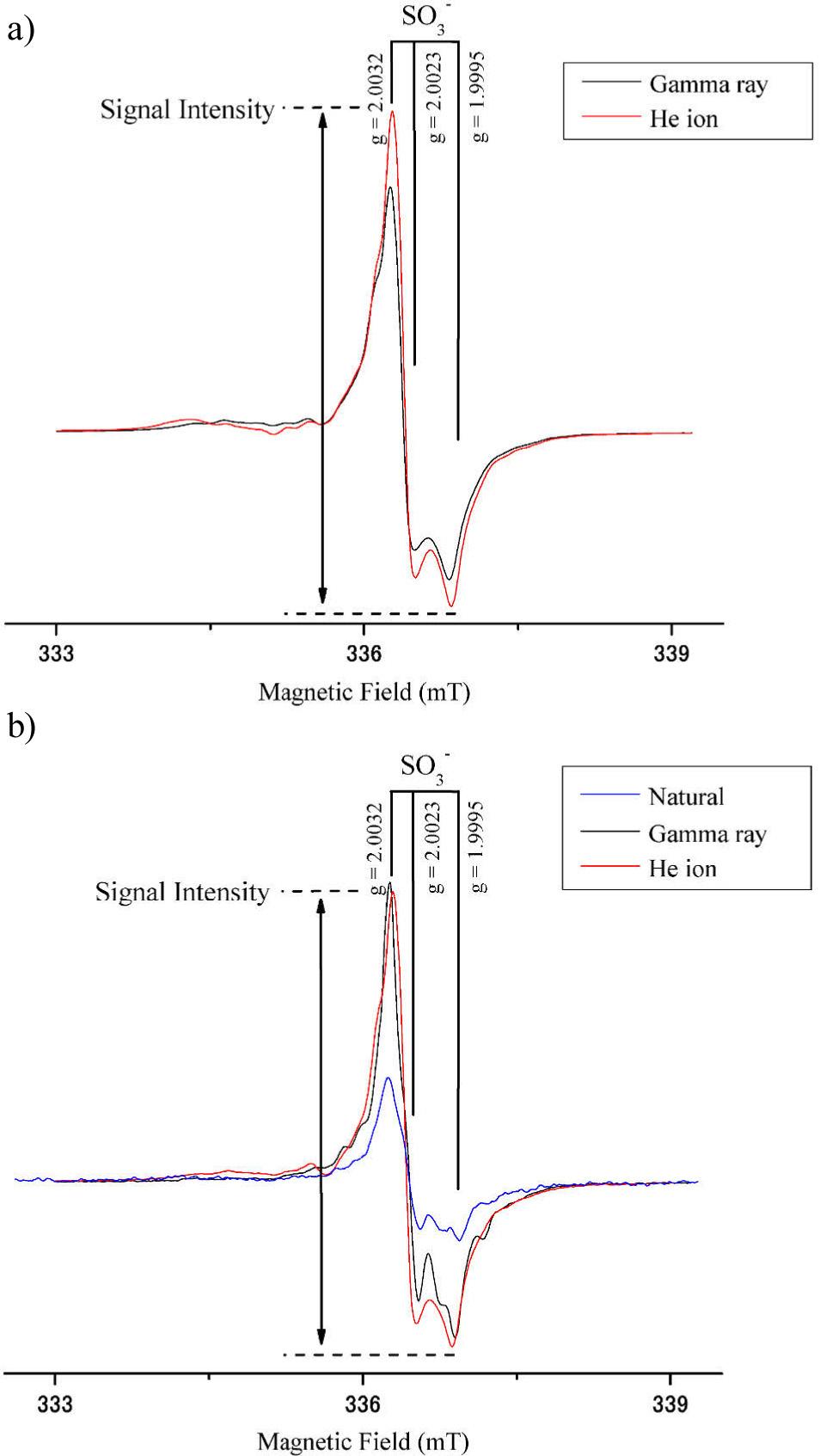 Dose responses of the ESR intensity of SO3- signal to (a) gamma ray and (b) He+ ion implantation doses.