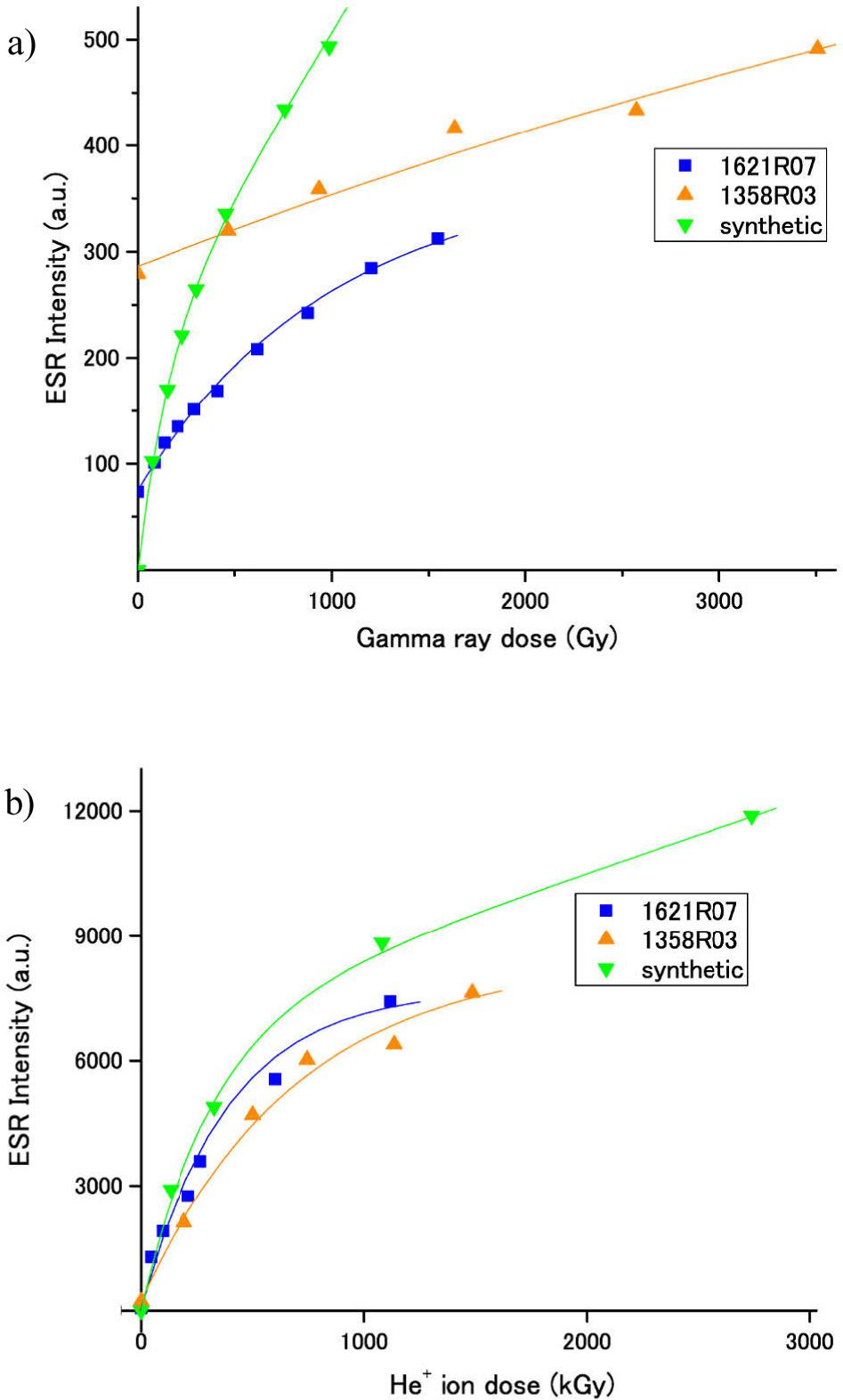 The ESR signal intensities were enhanced both by gamma ray irradiation and by He+ ion implantation as shown in Fig. 3 where single saturating exponential curves were fitted to the dose responses for natural samples and exponential with linear functions (Duval, 2012) were for the synthetic sample. The scattering of points for He+ ion implantation is much smaller than that in Toyoda et al. (2012). The error for the measurement of the signal intensity was typically within 1%, as the standard deviation of the intensities for separate aliquots of a same sample.