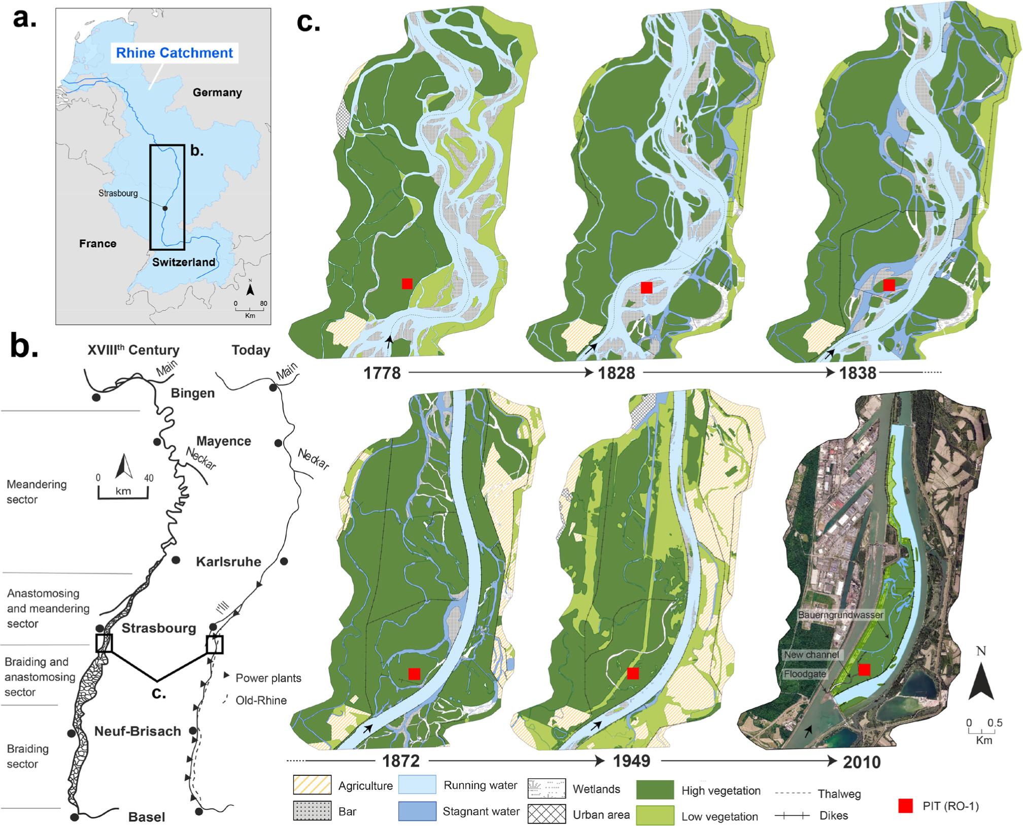 a.) Overview of the River Rhine catchment with the location of Strasbourg. b.) Comparison of the Upper Rhine system before and after river engineering works in the 19th and 20th century. c.) Historic development of the study area from AD 1778 until 2010.