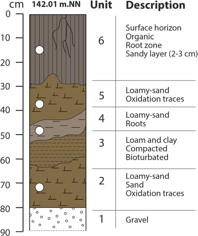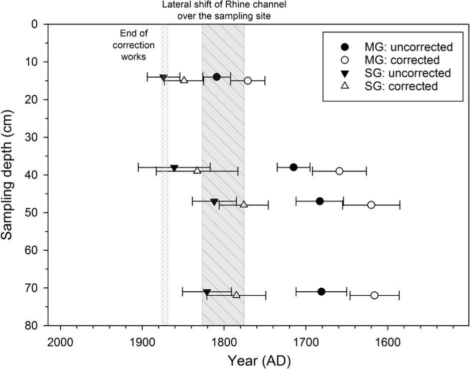 The study of old maps reveals that the upstream reach of the main watercourse of the island (the ‘Bauerngrundwasser’) was the thalweg of the River Rhine in AD 1828 (Fig. 1c). The excavation pit sampled for this study was located on a median bar of the Rhine braiding system at this date. During the correction works between AD 1828 and 1872, the River Rhine was forced artificially into an easterly direction. This caused a drastic decrease of flood energy and induced an important channel narrowing and disappearance of bars by vegetation overgrowth, as is shown on the maps of AD 1838, 1872 and 1949 (Fig. 1c). Prior to the correction works, between AD 1778 and 1828, the Rhine thalweg naturally and progressively moved from east to west, and this movement would have eroded any older fine sediments at the excavation site. Assuming that the main channel of the River Rhine passed this position sometime between AD 1790 and 1810 gives the maximum age of the sediments investigated here (225–205 years).