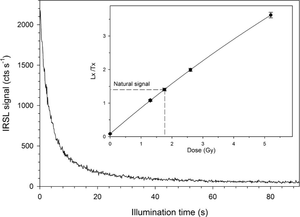 Example of IRSL decay for a multi-grain disc and a dose response curve of sample RO1-4 (inset).