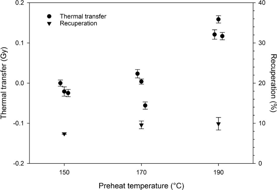 Results of thermal transfer tests experiments reveal a slight increase of De with increasing preheat temperature. Same applies for recuperation as monitored in the dose recovery experiments.