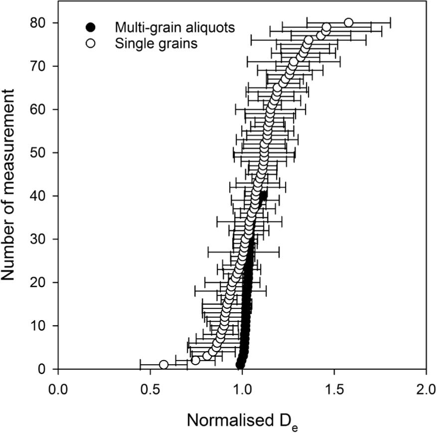 deally, luminescence dating would be carried out using single grain measurements as this will provide the full information about individual grain history. However, as this approach is quite laborious, De measurements are often made on aliquots consisting of several dozen grains. Here, it has to be considered that usually only few percent of the grains (in particular for quartz) exhibit OSL signals (e.g. Duller, 2004). Hence, using aliquots with not more than 100 grains will almost mimic single grain measurements. However, in particular for feldspar separates a much larger number of grains may exhibit luminescence signals. In such cases multi-grain approaches can cause averaging of the signal originating from individual grains and mask incomplete bleaching at least to some extent (Wallinga, 2002).