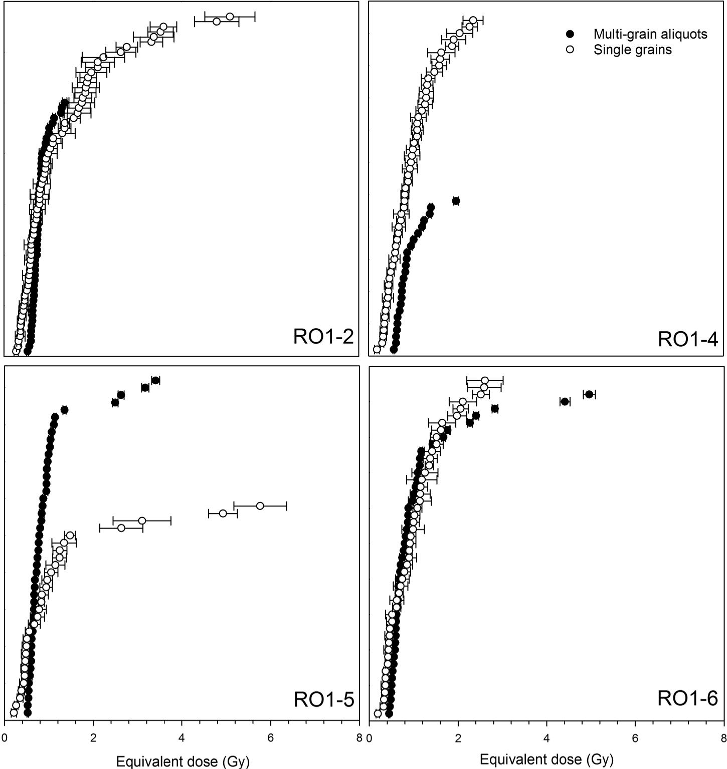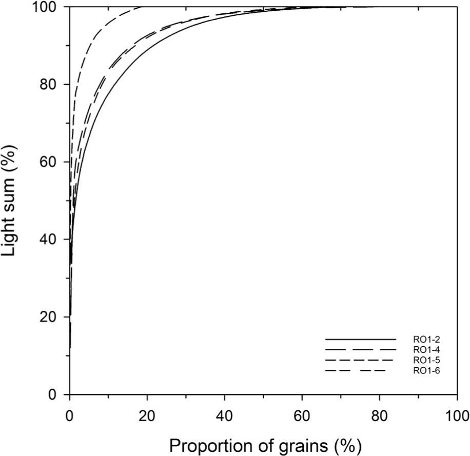 The light-sum plots (Fig. 7) show that in three of the samples (RO1-2, 4, 6) about 10% of all grains are responsible for 80% of the light emitted. The remaining 20% of the signal origin from ca. 50% of the grains, whereas ca. 40% emit very little to no IRSL. For sample RO1-5, 10% of the grains emit close to 95% of the signal, with 80% of the grains being dim. However, in contrast to Reinmann et al. (2012) we find no relationship between brightness and De.