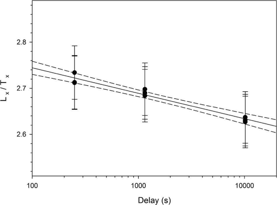 Storage tests to monitor IRSL signal decay due to fading have been carried out at room temperature (c. 20°C) on multi-grain aliquots and single grains that were previously used in the dose recovery test and applying a dose of 39 Gy. This much larger dose than in the natural was chosen to improve reproducibility, as the single grains signal are not very bright. Immediate measurements of Lx/Tx (ca. 250 s between half-time irradiation and beginning of stimulation) and two delayed measurements (1150 s, 10,150 s) were carried out and repeated three times. Preheat was applied immediately after the irradiation, i.e. before the storage. From this data, g-values have been calculated following Huntley and Lamothe (2001).