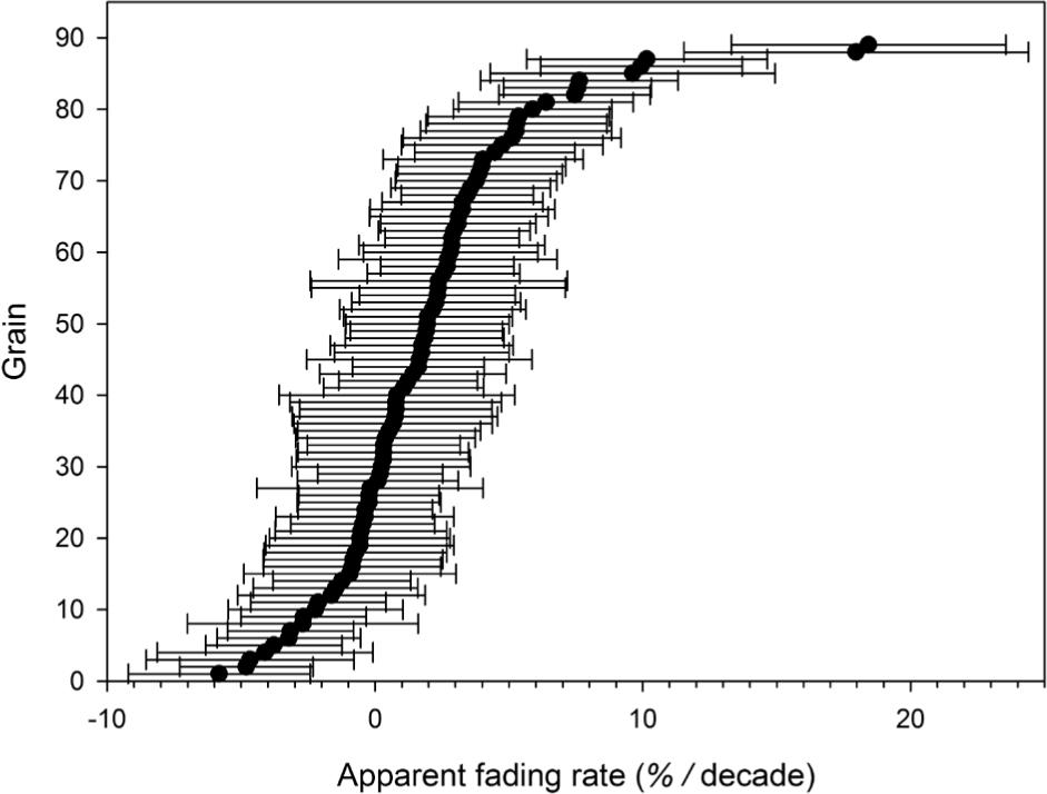 The storage tests carried out on multi-grain samples to estimate the fading rate (Fig. 8) gave g-values between 1.6 ± 0.4 and 2.4 ± 0.3%/decade, overlapping within uncertainties. This represents an average g-value of 2.2 ± 0.2%/decade (standard deviation). For singlegrains, fading rates range from −5.82 ± 3.40 und 18.43 ± 5.12%/decade (Fig. 9). These individual fading rates represent a mean of 1.9%/decade, with a large standard deviation of 4.0 and a standard error of 0.4, overlapping within uncertainties with the values determined for multi-grains. However, negative fading rates are not reasonable considering these describe loss of signal and as there are no obvious mechanisms that could explain the apparent significant signal gain. Of the 89 fading rates determined for single grains, 27 show a negative value (30%). This raises the question if it is necessary to apply individual fading rates for single grains. Trauerstein et al. (2012) suggest to determine individual fading rates, as their average single grain g-values deviate systematically from single aliquot ones. This observation cannot be confirmed in this study where the average single grain and multi-grain aliquot g-values agree well within errors. Furthermore, Rhodes (2015) highlights that measurements of each grain after a delay to assess fading are at the limit of being able to assess whether laboratory fading is shared between grains, or whether it is different for each grain. Applying a Chi-squared (χ2) test to the present data set gives a χ2 value of 121 (for n= 89); this would rather imply the presence of a non-Gaussian distribution. However, removing the two highest values (g ca. 18%/decade) results in χ2 = 100, hence a value quite close to χ2 = n−1, which would indicate a Gaussian distribution. As a consequence, we cannot exclude that the observed spread of individual single grain fading rates is presenting a common mean value that is representative for all grains. Hence, we decided to apply the fading rate determined for multi-grains also to the single grains.