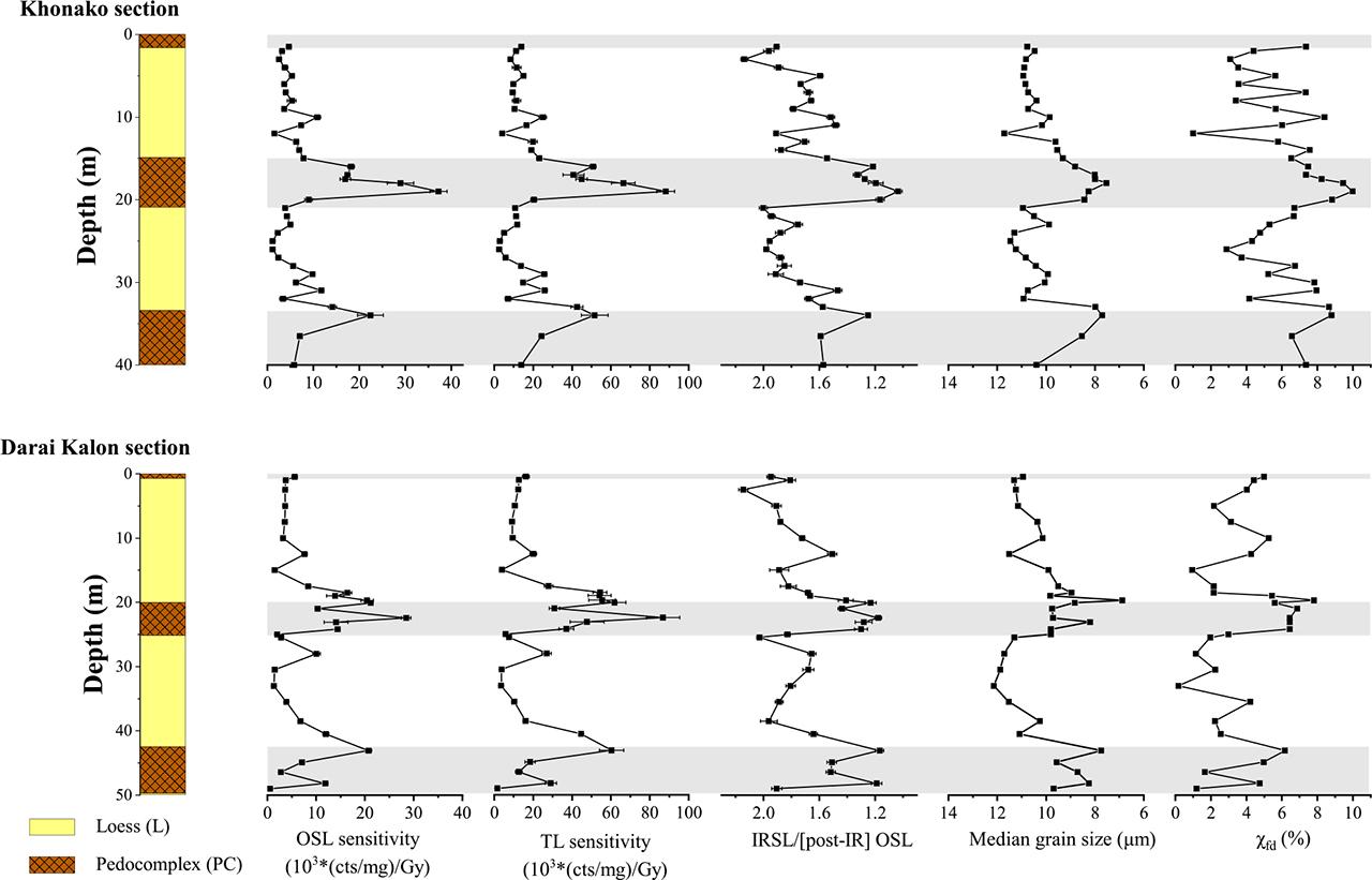 Variations of 4–11 μm quartz OSL and 110°C TL luminescence sensitivity, IRSL/[post-IR] OSL ratio, median grain size and frequency-dependent magnetic susceptibility (χfd) for the samples from Khonako (above) and Darai Kalon (below) sections.
