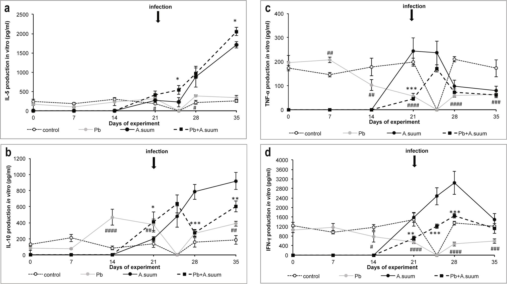 Cytokine production (a) IL-5, (b) IL-10, (c) TNF-α, (d) IFN-γ by mouse splenocytes intoxicated with lead (Pb) and infected with A. suum. #(P<0.05); ##(P<0.01); ###(P<0.001); ####(P<0.0001) statistically significant differences between control and heavy metal’s intoxication without parasitic infection; *(P<0.05); **(P<0.01); ***(P<0.001) statistically significant differences between A. suum infection and heavy metal’s intoxication in combination with A. suum infection.