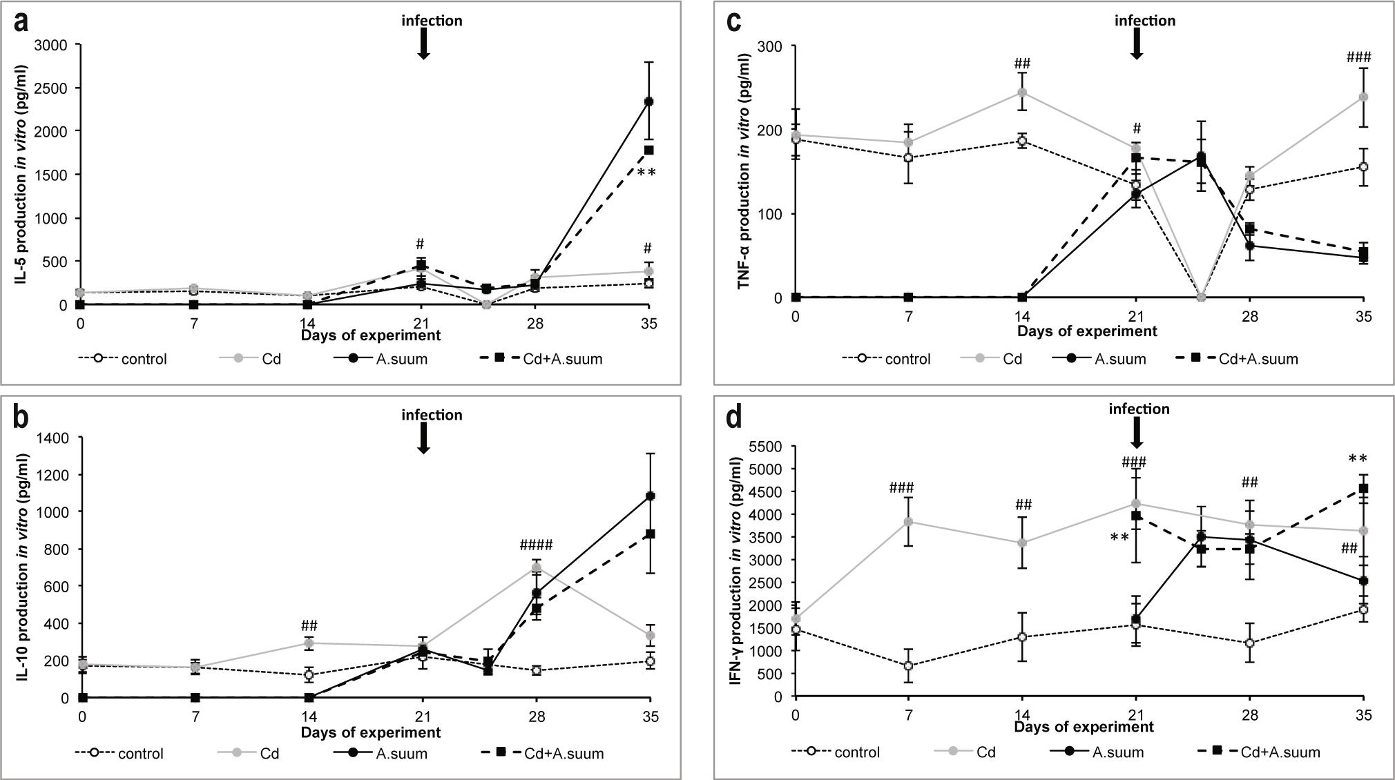 Cytokine production (a) IL-5, (b) IL-10, (c) TNF-α, (d) IFN-γ by mouse splenocytes intoxicated with cadmium (Cd) and infected with A. suum. #(P<0.05); ##(P<0.01); ###(P<0.001); ####(P<0.0001) statistically significant differences between control and heavy metal’s intoxication without parasitic infection; **(P<0.01) statistically significant differences between A. suum infection and heavy metal’s intoxication in combination with A. suum infection.