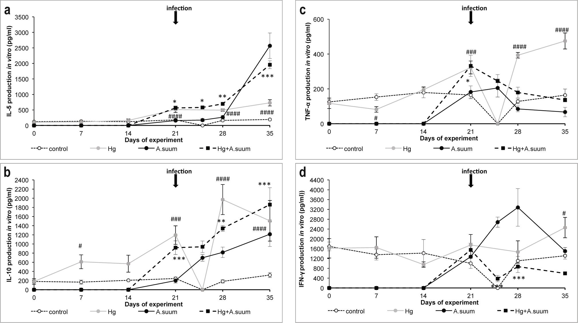 Cytokine production (a) IL-5, (b) IL-10, (c) TNF-α, (d) IFN-γ by moue splenocytes intoxicated with mercury (Hg) and infected with A. suum. #(P<0.05); ###(P<0.001); ####(P<0.0001) statistically significant differences between control and heavy metal’s intoxication without parasitic infection; *(P<0.05); **(P<0.01); ***(P<0.001) statistically significant differences between A. suum infection and heavy metal’s intoxication in combination with A. suum infection.