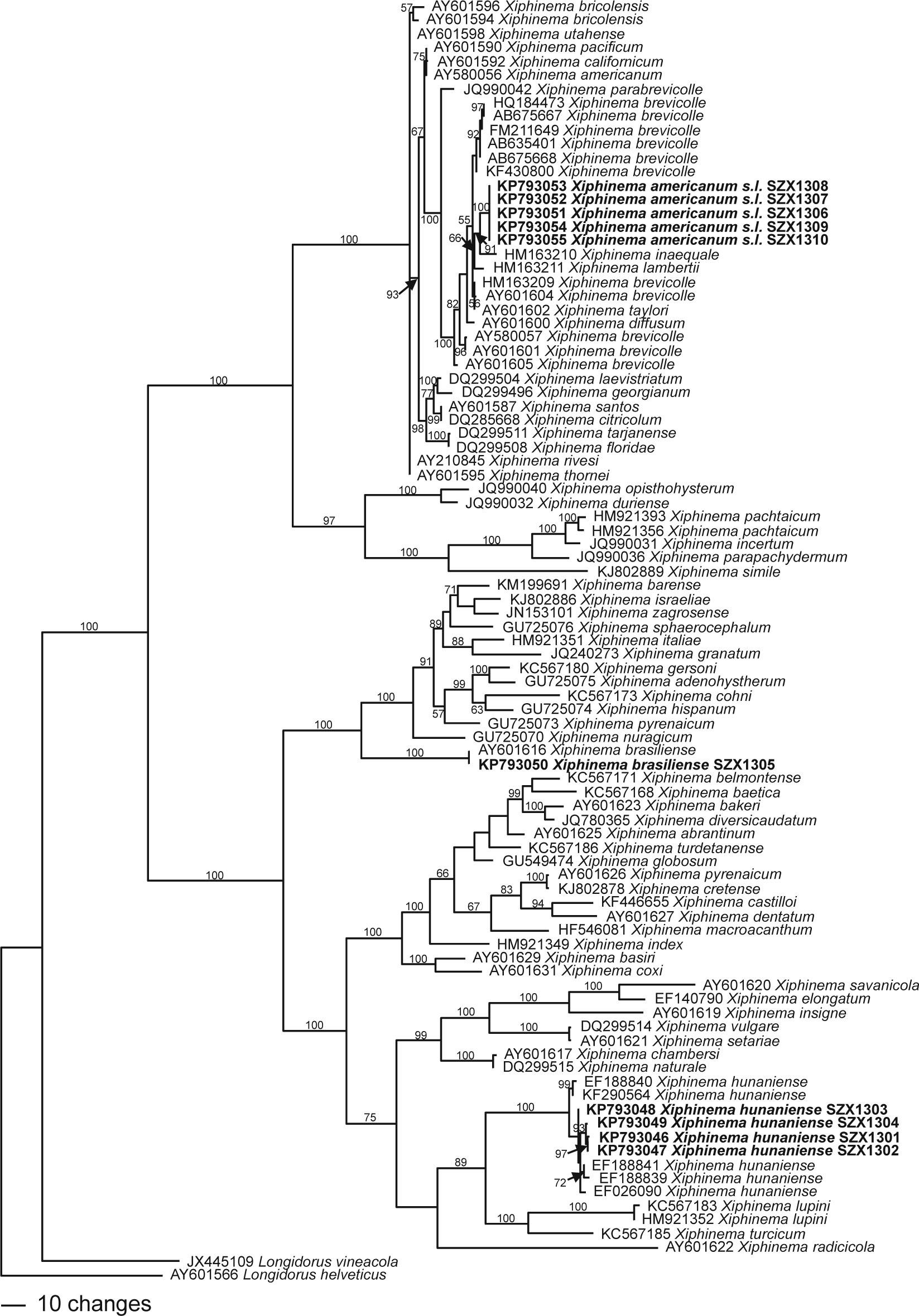 | Xiphinema brasiliense | SZX1305 | Yangmeikeng, Shenzhen | Gleichenia linearis | KP793040 . | KP793050 |