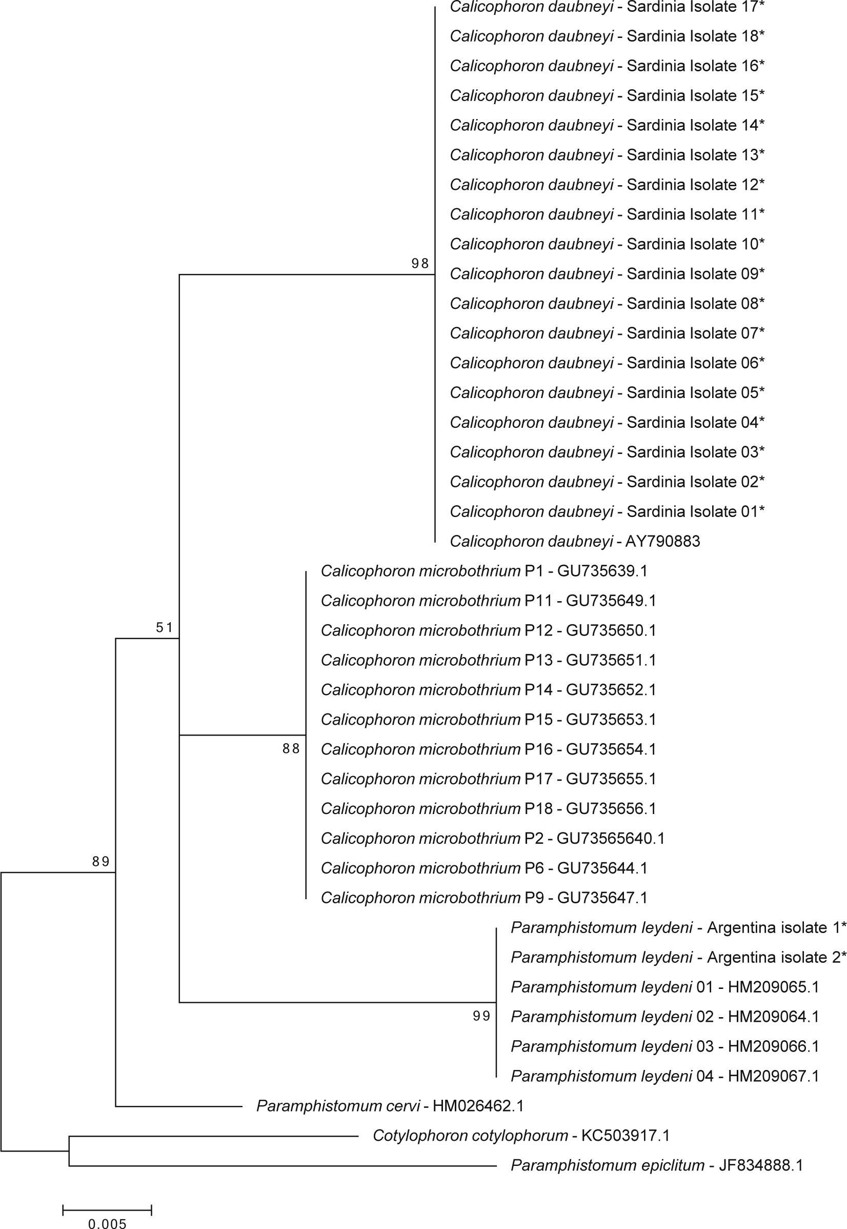 The sequences of Sardinian Paramphistomidae showed a pairwise distance of 0.022 to C. microbothrium, 0.045 to C. cotylophorum and 0.052 to P. epiclitum (Tamura et al., 1993). The phylogenetic tree (Fig. 1) show as Sardinian samples clustered all together with C. daubneyi and were separated to other species from the genus Calicophoron, Cotylophoron and Paramphistomum (Fig. 1).