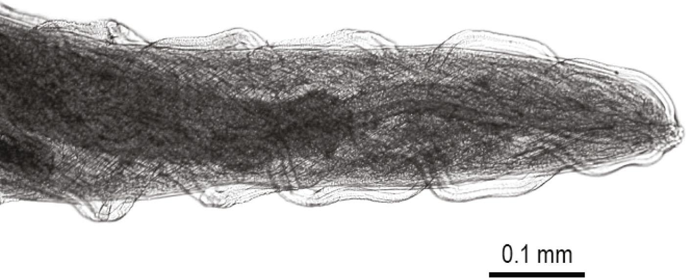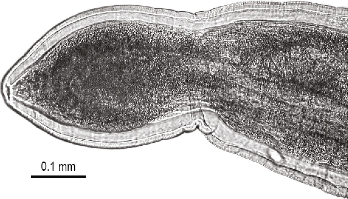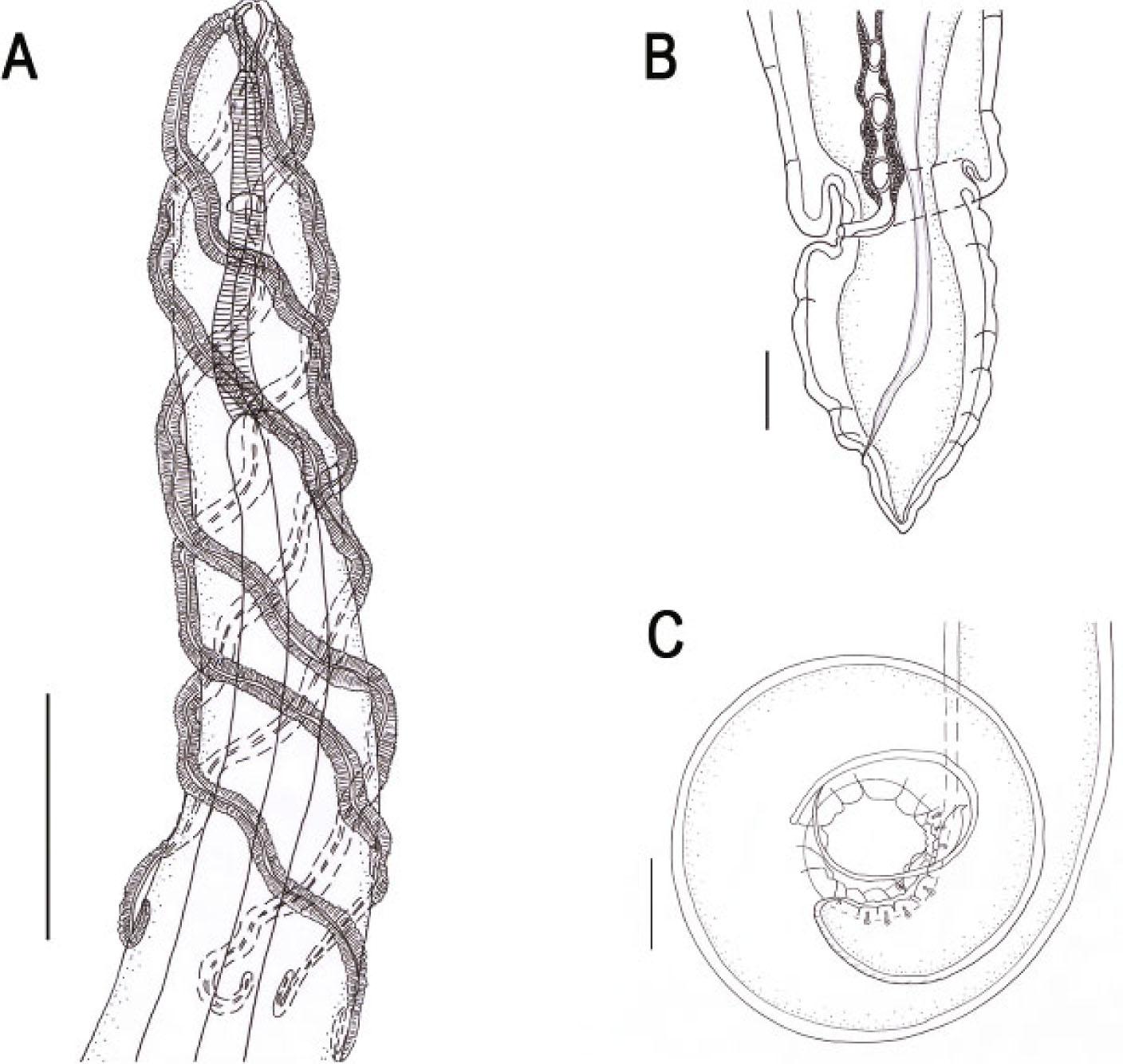 Chordatortilis crassicauda Mendonҫa et Rodriguez, 1965. A, anterior end, female, lateral view; B, posterior end, female, lateral view; C, posterior end, male, lateral view. Scale bars: A, 250 μm; B, C, 100 μm