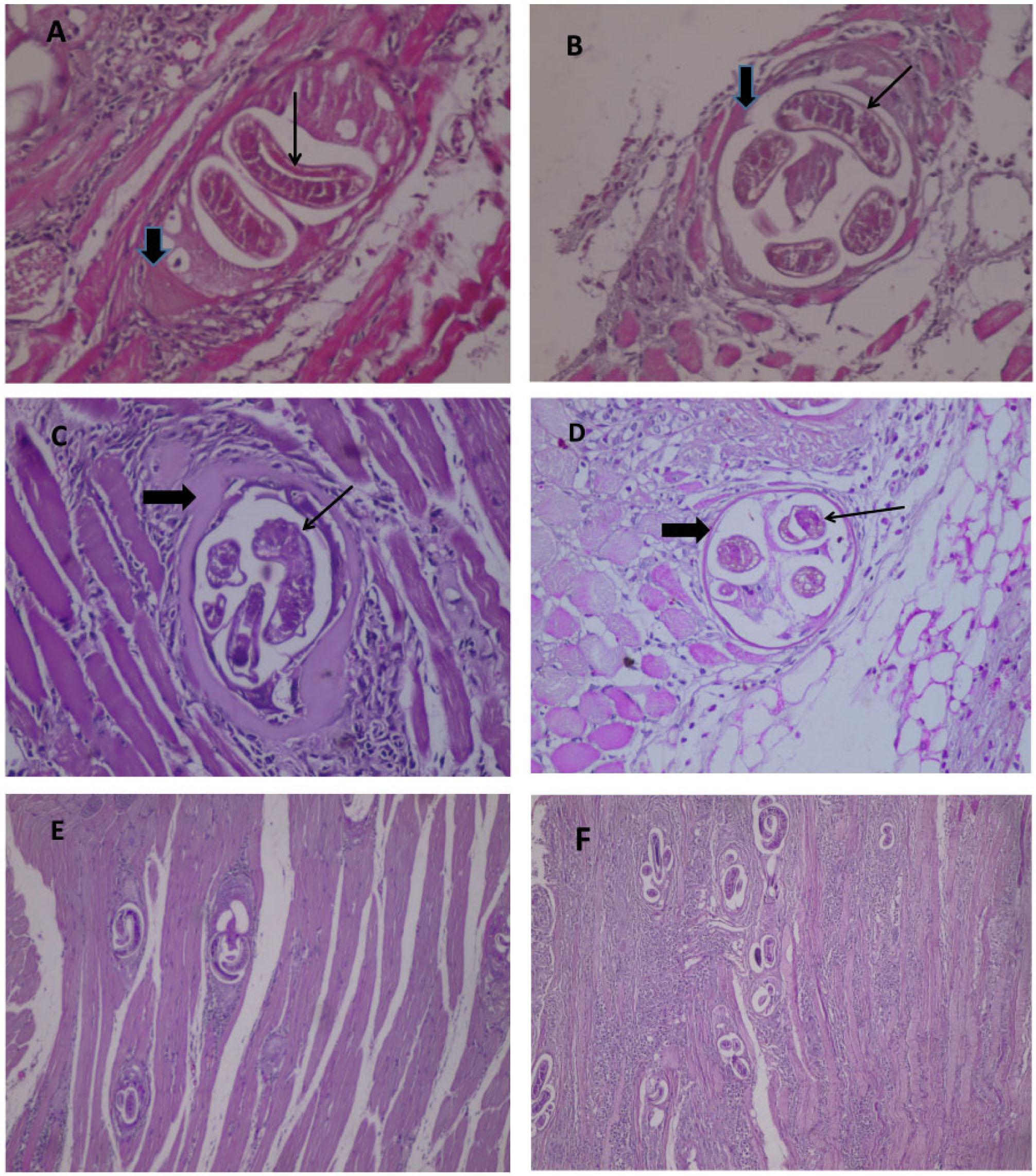 Photomicrographs of skeletal muscle sections 5 weeks p.i. showing: A,C encapsulated larvae from the control infected mice. The collagenous capsule (thick arrow) surrounds sections of Trichinella larvae (thin arrow) (PAS, H&E × 400). B,D thinning of the capsule (thick arrow) around the larvae (thin arrow) in the treated mice (PAS, H&E × 400). E, mild to moderate inflammatory reactions around larvae in the control group (H&E × 100). F, moderate to marked intensity of inflammation around the encapsulated larvae and in between muscle fibres in the treated group (H&E × 65)