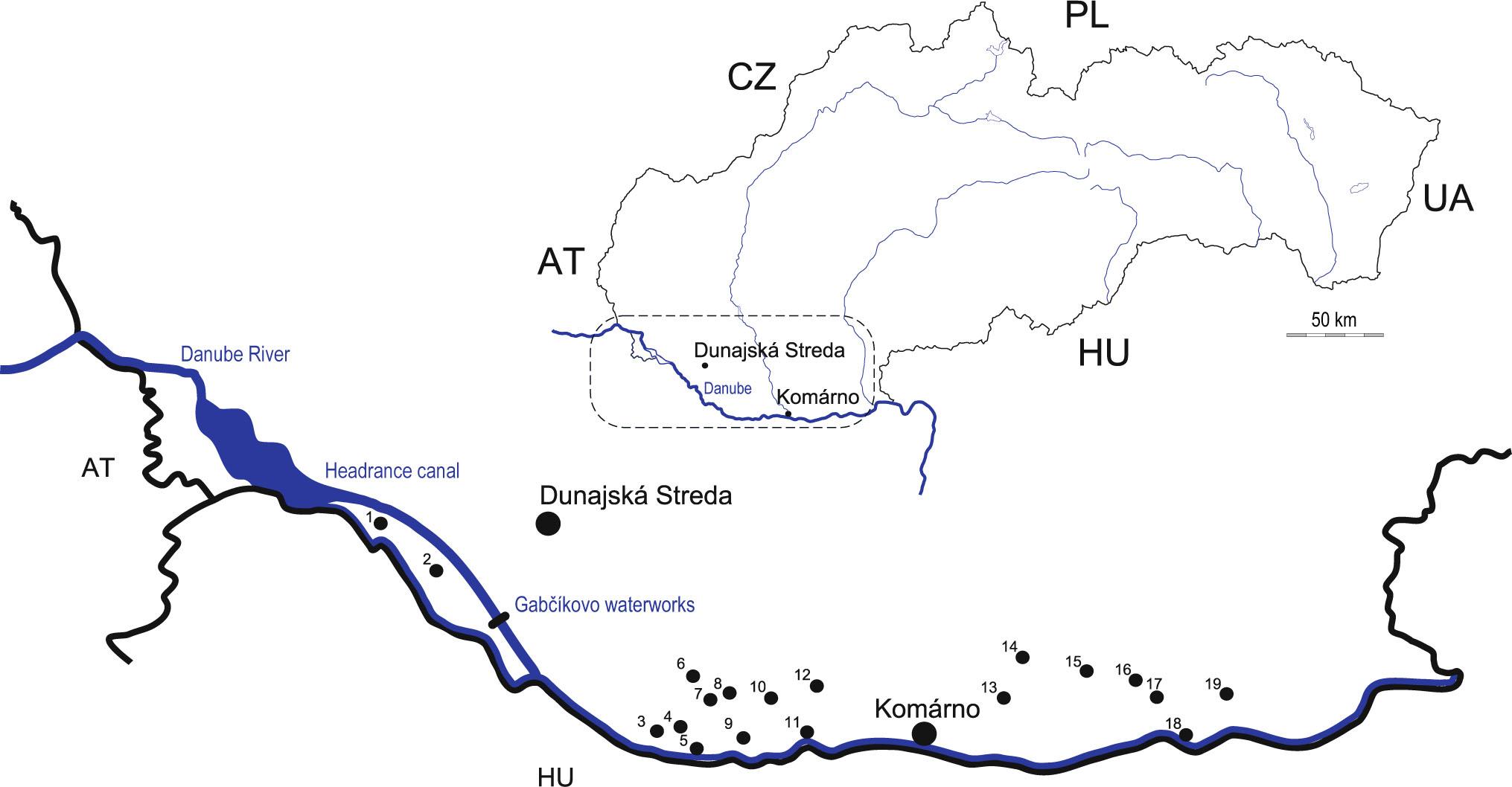 Geographic origin of Fascioloides magna from southwestern Slovakia analyzed in current study. 1 – Vojka nad Dunajom, 2 – Bodíky, 3 – Číčov, 4 – Trávnik, 5 – Klížská Nemá, 6 – Holiare, 7 – Tôň, 8 – Zemianska Olča, 9 – Vel’ké Kosihy, 10 – Okolicná na Ostrove, 11 – Zlatná na Ostrove, 12 – Calovec, 13 – Chotín, 14 – Svätý Peter, 15 – Modrany, 16 – Bátorové Kosihy, 17 – Búč, 18 – Kravany nad Dunajom, 19 – Svätý Juraj, Pereš. The respective localities were visualized using the DIVA-GIS available from http://www.diva-gis.org