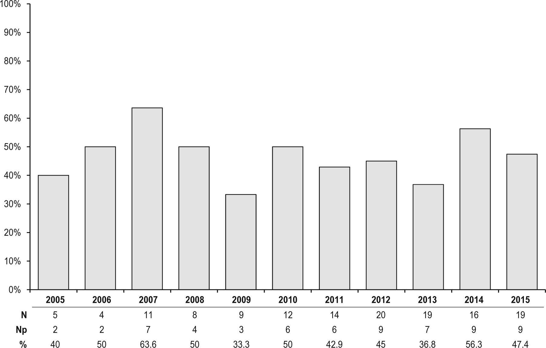 Prevalence of Fascioloides magna in red deer in southwestern Slovakia in the respective years during the period of 2005–2015. N – number of examined red deer, Np – number of red deer infected with F. magna, % – prevalence of fascioloidosis