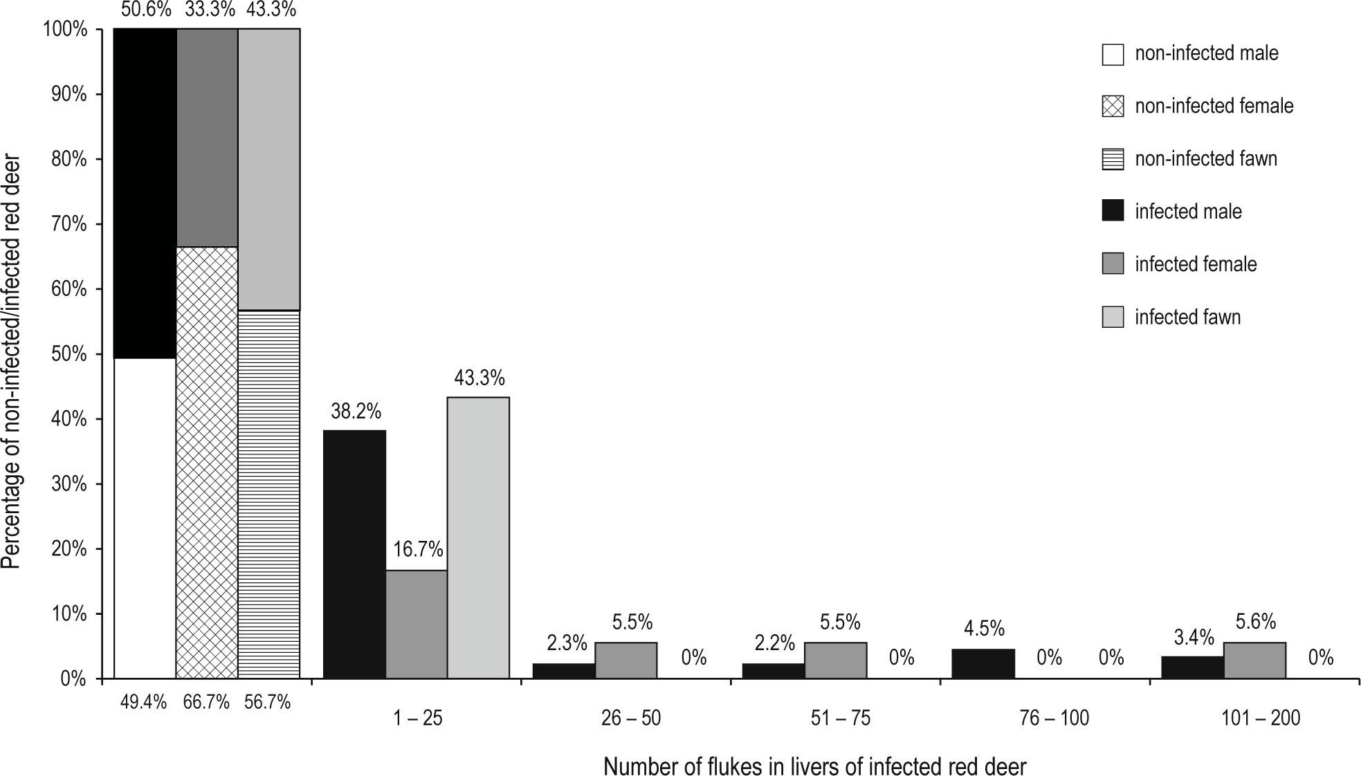Out of 137 livers examined, 64 (46.7 %) of them were found to be infected with F. magna. The number of cysts within the livers varied from one to more than 40. Most pseudocysts contained two and more (up to 6) adult flukes; however, some of them were filled with amorphous material with the absence of flukes. The lowest prevalence (33.3 %) was documented in 2009, while in 2007 the overall prevalence reached up to 63.6 % (Fig. 2). Prevalence of fascioloidosis varied between sexes and age categories; while the lowest overall prevalence was detected in red deer females (33.3 %), higher values were documented for males (50.6 %) and fawns (43.3 %) (Fig. 3). The most frequent number of flukes found within infected livers was 1 – 25 flukes that were determined in 38.2 % males, 16.7 % females and 43.3 % of fawns. The total number of 26 – 50 and 51 – 75 flukes per liver was found in 2.3 % and 2.2 % of males, respectively and congruently in 5.5 % of females. The higher number of flukes (76 – 200) was found in males (4.5 % and 3.4 %) and females (5.6 %); fawns were never found to be infected with higher number of flukes than 25. Regarding the individual parasite burden, the maximum number of 180 flukes was detected in the liver of four-year old red deer female hunted in the locality Cícov in 2007. In addition, 124 flukes were found in liver of three-year old red deer male from Vel’ké Kosihy in 2008, and 111/112 flukes were obtained from two red deer male hunted in Cícov in 2010 and 2015, respectively. The higher values of overall prevalence detected in red deer males can be closely related with frequent migration/swimming across the Danube River, especially during the mating season, what can result in their wider geographic range. On the other hand, distribution of red deer females and their migration pattern is more restricted what reduces the risk of F. magna infection.