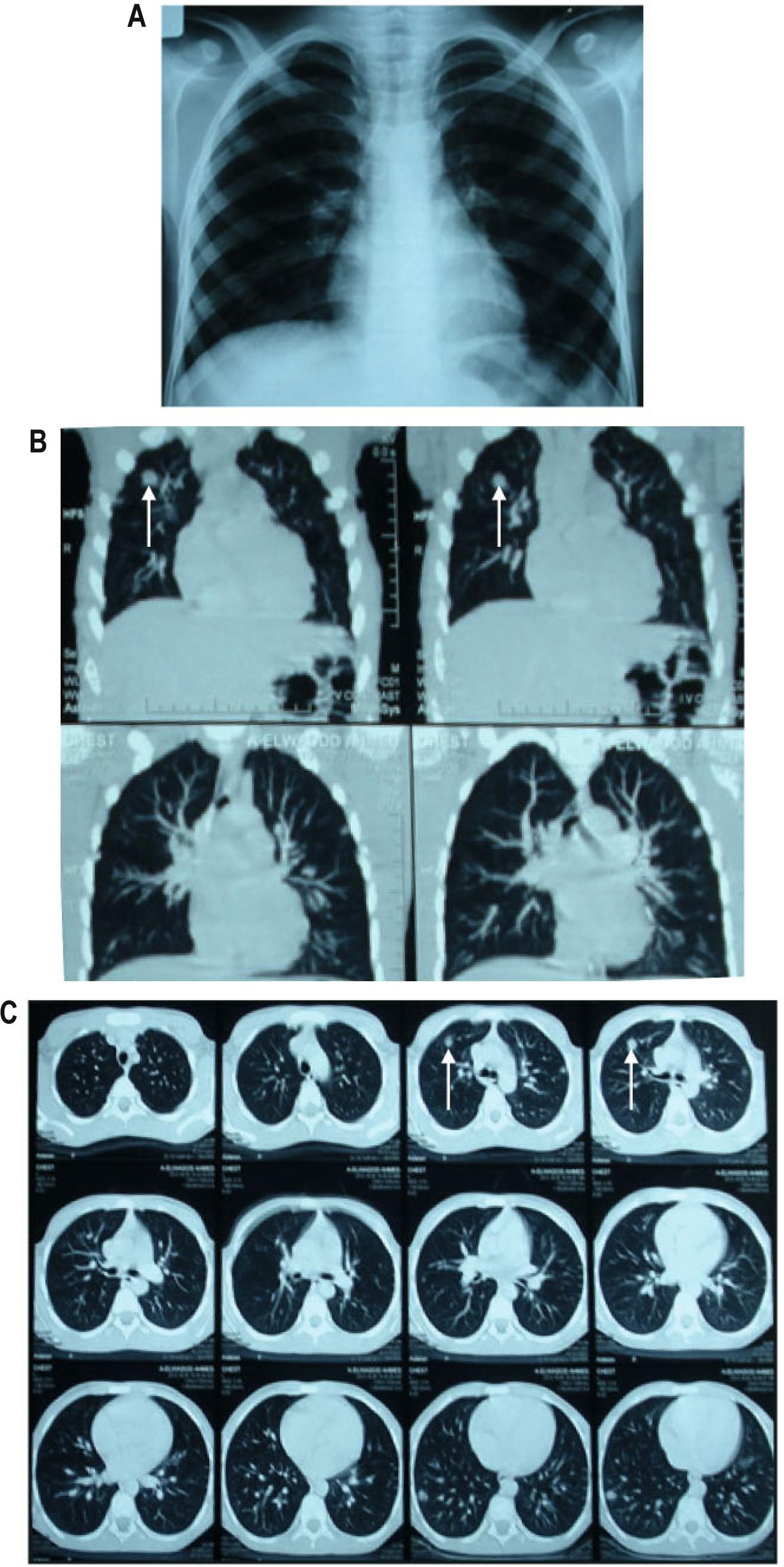 Chest X-ray showed an infiltrative shadow in both middle and lower lung fields mainly in the right lung (Fig. 1A). Using Post-Contrast Spiral CT Chest (Fig.1B and C), the chest was scanned in 10mm continuous slices from the rout of the neck caudally to the suprarenal glands. Lung CT showed bilateral multiple sharply defined, smoothly marginated, rounded pulmonary nodules measuring less than 1 cm in diameter with centrilobular pattern and characteristic tree in bud sign. The most predominant two pulmonary nodules demonstrated mainly in the anterior segment of upper lobe and lateral segment of lower lobe of right lung field respectively (indicated by arrows). Chest CT showed clearly patent airways down to the segmental bronchi i.e no endoluminal lesion or extrinsic compression. There is no pleural thickening or effusion and no hilar or mediastinal lymphadenopathy.