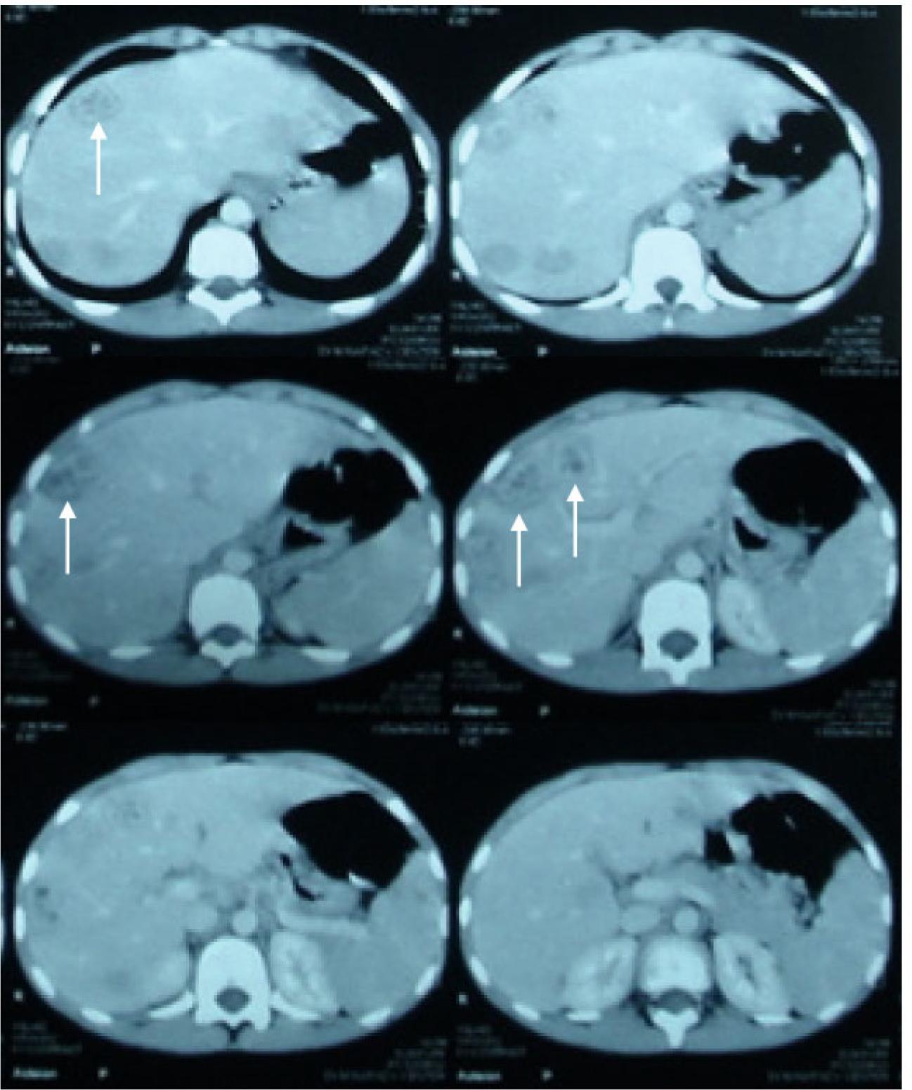 Upper abdominal CT showing multiple discrete hypodense hepatic focal lesions in both hepatic lobes more obvious at right lobe