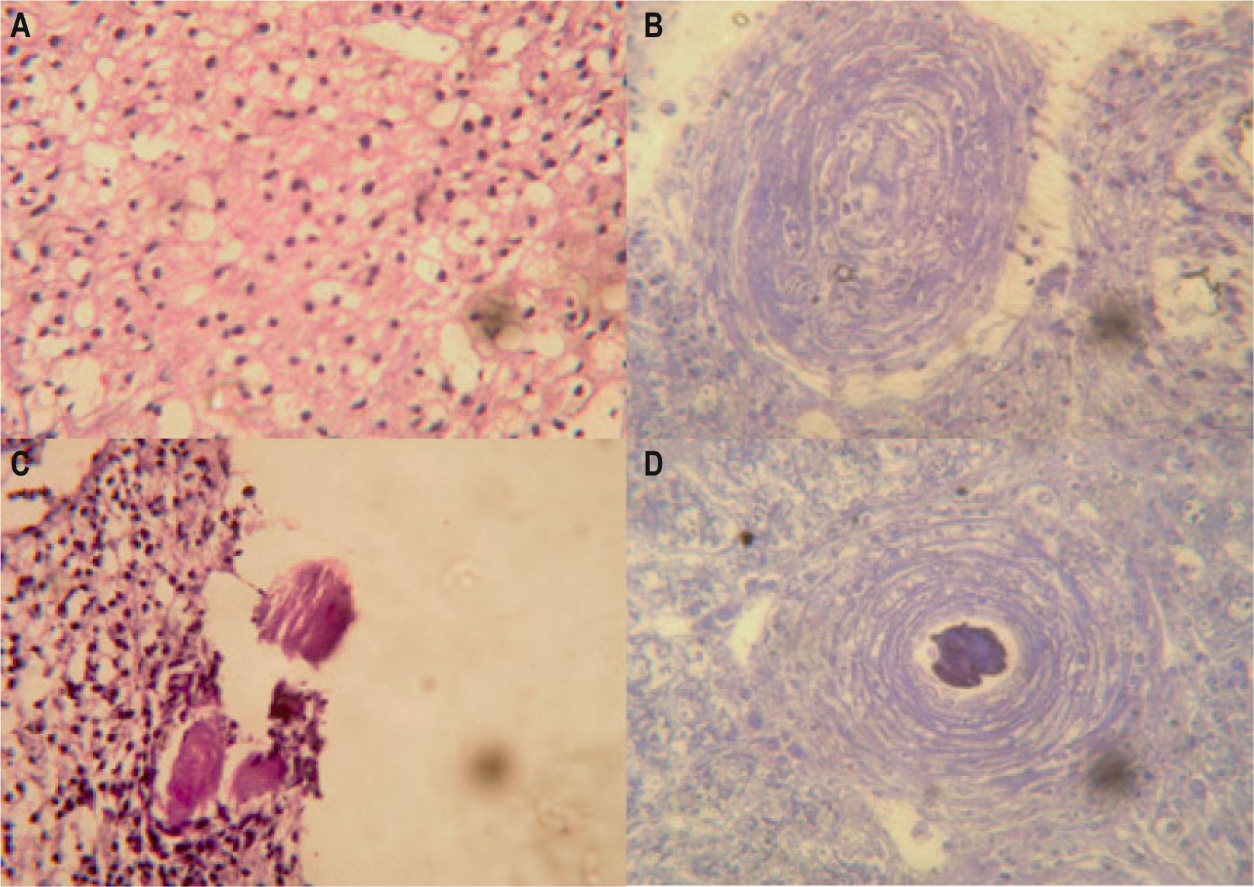 Histo-pathology of liver biopsy demonstrates. (A) Alteration of the normal architecture of the liver with fatty degeneration of liver cells. Hematoxylin and eosin stain × 40. (B) Multiple eosinophilic granulomas in liver tissues. Hematoxylin and eosin stain × 40. (C) and (D) The larvae appear in the center of the granuloma. Hematoxylin and eosin stain × 40.