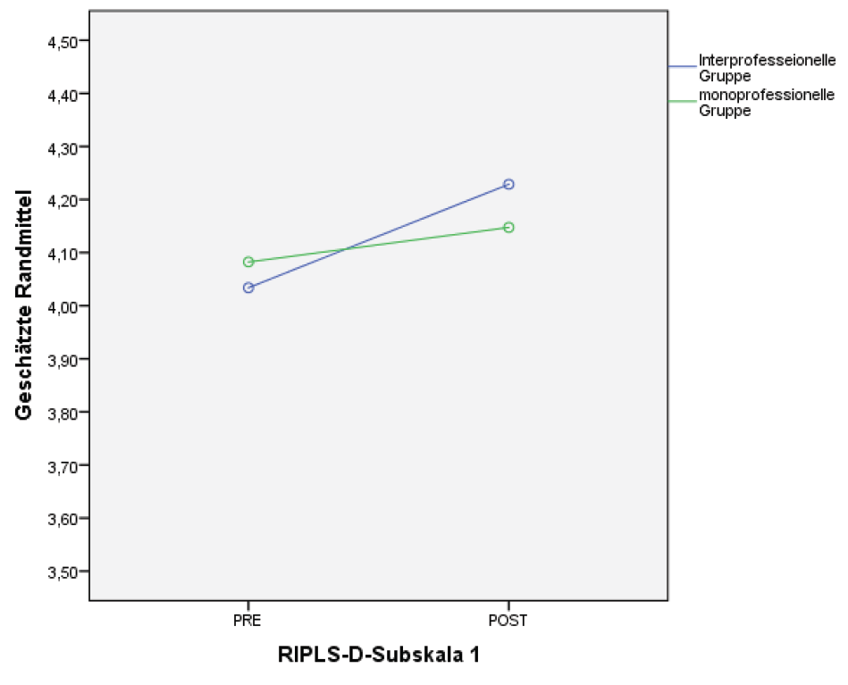 Abbildung 1 zeigt den Interaktionseffekt. Die interprofessionell unterrichteten Medizinstudierenden verbesserten sich in der Selbsteinschätzung im Prä/ Post-Vergleich auf der Skala von MW = 4.03 (SD = 0.43) auf MW = 4.23 (SD = 0.51), während sich die monoprofessionell unterrichteten Medizinstudierenden von MW = 4.08 (SD = 0.49) auf MW = 4.15 (SD = 0.55) verbesserten (siehe Abb. 1).