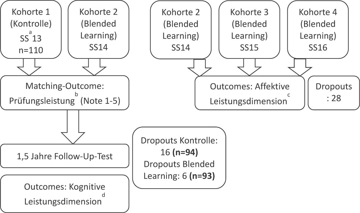 Die vorliegenden Studienergebnisse sind als die einer beobachtenden Kohorten-Studie ohne experimentelles Design im Sinne einer Randomisierung oder Block-Randomisierung zu verstehen und zu interpretieren. Untersucht man den Langzeiteffekt von Lernergebnissen, muss man die Resultate in Bezug auf eine Reihe von nicht-isolierbaren Einflussfaktoren kritisch betrachten. Lernergebnisse, die unmittelbar nach Abschluss des Lernprozesses überprüft werden, unterliegen in der Regel kaum weiteren direkten Einflussfaktoren. Liegen aber wie bei der vorliegenden Studie zwischen Lernprozess und Überprüfung der Lernergebnisse 1,5 Jahre und gibt es keine Ergebnisse unmittelbar nach der Lehrveranstaltung, kann davon ausgegangen werden, dass das ursprüngliche Lernergebnis durch eine Reihe von Einflussfaktoren verändert wurde: Studierende erweitern ihren Erfahrungshorizont laufend durch stattfindende Lernprozesse, die zwar nicht unmittelbar auf dieselbe Thematik abzielen, aber durch erwünschte Verknüpfungen jedenfalls das Themenfeld bereits abgeschlossener Lehrveranstaltungen berühren. Die Vernetzung von Lernergebnissen, die in aufeinander aufbauenden Lehrveranstaltungen angestrebt wird, trägt demnach dazu bei, dass Studierende Lernergebnisse in ihren individuellen Kontext einbetten. Es darf aber auch nicht übersehen werden, dass gerade bei einem Lernprozess, der zur Berufsqualifikation führen soll, der Langzeiteffekt von Lernergebnissen relevant für einen erfolgreichen Berufseinstieg ist. Die nicht-isolierbaren Einflussfaktoren wirken jedoch in der vorliegenden Untersuchung auf Kontroll- und Blended-Learning-Kohorte, wodurch die Auswertung der Daten nicht beeinträchtigt sein sollte.