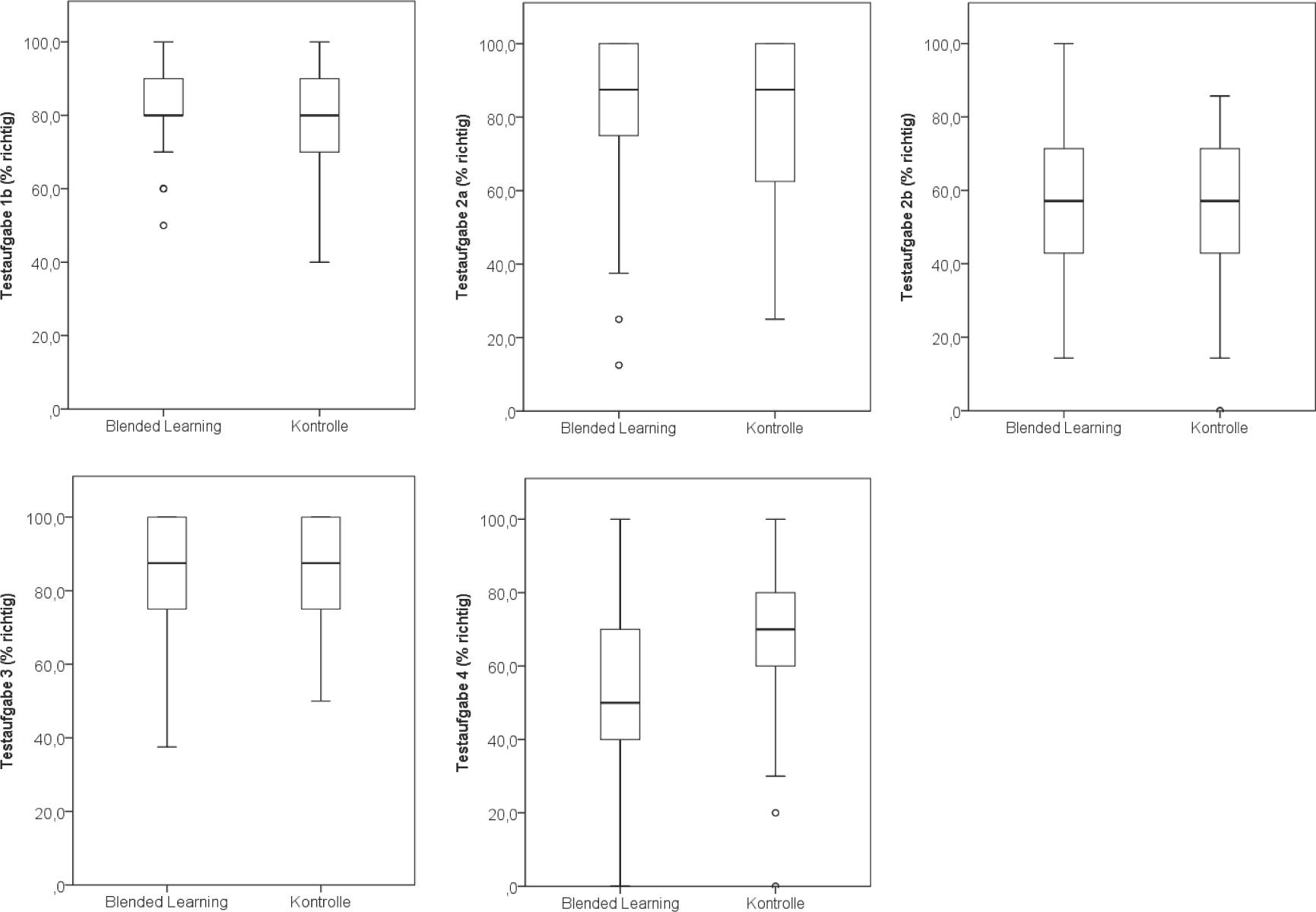 Die Normalverteilung der Daten (Testaufgabe der Lernzielstufen 1b und 2–4) wurde mittels Shapiro-Wilk-Test und zusätzlicher grafischer Kontrolle von Histogrammen mit Normalverteilungskurven überprüft. Da bei keinem der Outcome-Parameter ein metrisches Skalierungsniveau und eine Normalverteilung gegeben war, kamen nicht-parametrische Darstellungs- und Prüfverfahren zur Anwendung. Zur Prüfung von Unterschieden zwischen Blended-Learning- und Kontroll-Kohorte wurde der Mann-Whitney-U-Test angewendet. Der Unterschied zwischen den beiden Gruppen in der Lernzielstufe 1a (dichotomes Datenniveau) wurde mittels Chi-Quadrat-Test berechnet. Das Signifikanzniveau (α) wurde auf p<0,05 festgesetzt.