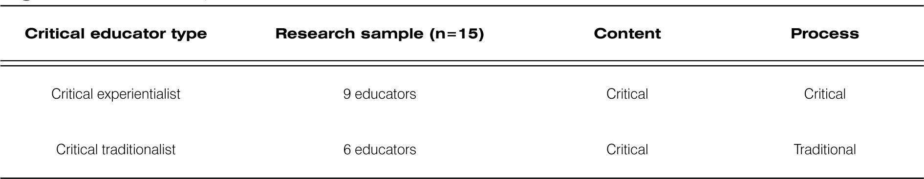 The content or process dimension relates to an emphasis on what or how they practise. The traditional or critical dimension relates to their orientation to process. Traditional process includes using more of the lecturing method and critical process includes using more experiential teaching methodologies. The following is a summary of both critical educator ideal types.