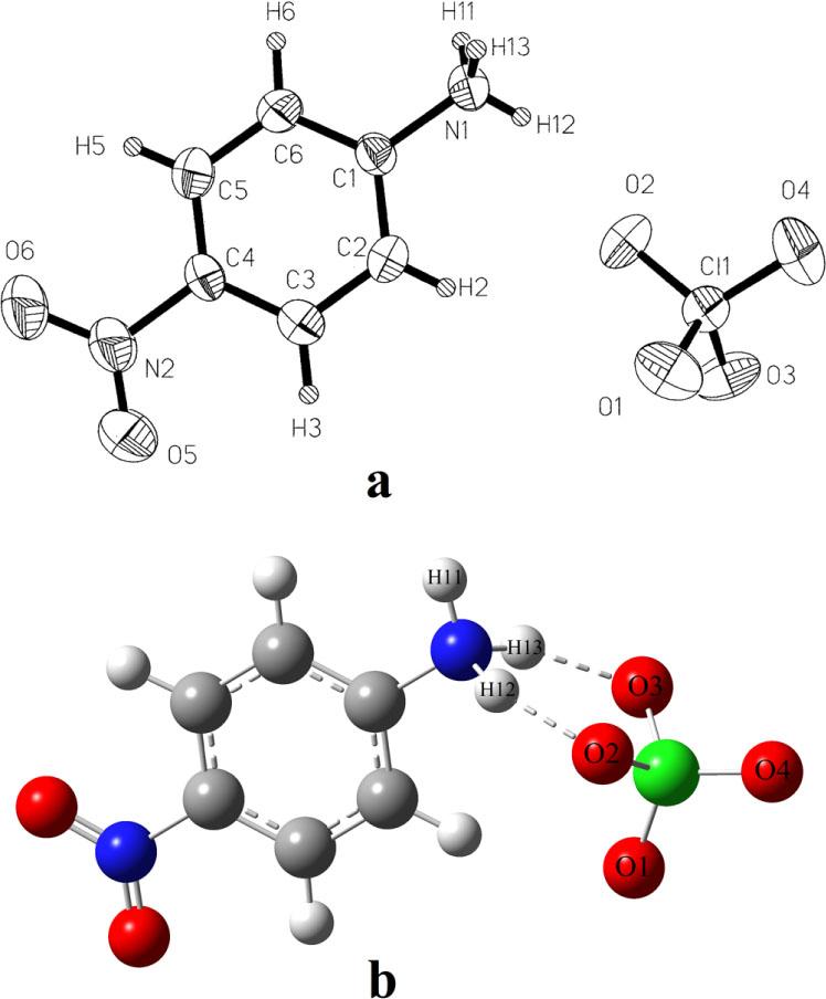 (a) Experimental molecular structure, (b) optimized molecular structure of p-nitroanilinium perchlorate obtained at B3LYP/6-311++G(d,p) level.