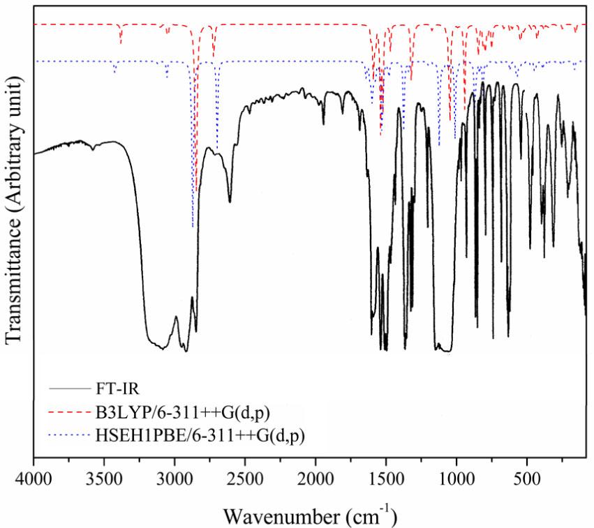 The nitro group vibration peaks of PNAPC complex were found as very close to that of simple nitro compounds [24] due to the presence of nitro group in free state. According to “internal modes” analysis, in-plane bending vibration of nitro group was found at 841 and 860 cm-1, with the relative contribution of 34 %. The out-of-plane vibrations were found at 744 and 788 cm-1 with the relative contribution of 51 %. The C–N stretching peak observed at 1203 cm-1 [8] is one of the most useful peaks for distinguishing individual nitro containing compounds, and this peak was found at 1174 and 1200 cm−1 for B3LYP and HSEH1PBE levels, respectively.