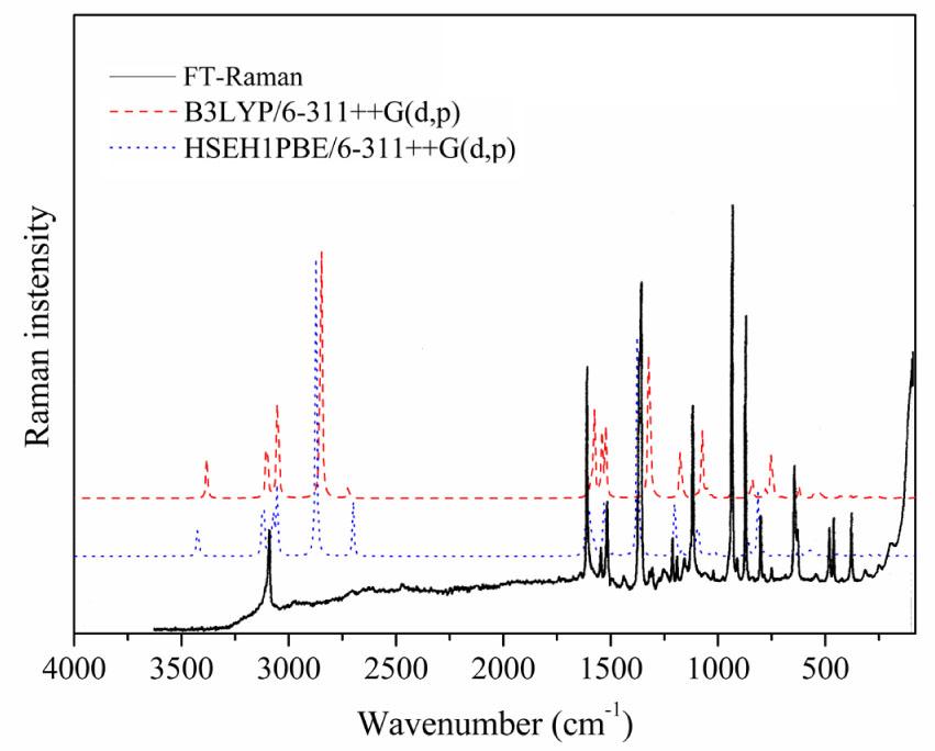 The IR and Raman spectra for PNAPC molecule have been simulated by using B3LYP and HSEH1PBE levels and the obtained results are given in Fig. 2 and Fig. 3 as compared with FT-IR and FT-Raman results [8]. The calculated vibration frequencies, the percentage of relative contribution of various internal co-ordinates and approximate descriptions of normal modes are listed in Table 3. Frequency calculations at the same levels of theory revealed no imaginary frequencies, indicating that an optimal geometry at these levels of approximation was found for PNAPC. It is well known that DFT levels overestimate the vibration wavenumbers due to the neglecting of anharmonicity, lack of electron correlation effects and basis set deficiencies [19]. So, the scaling factor 0.9614 [20] was used providing closer results to the experimental ones [8].